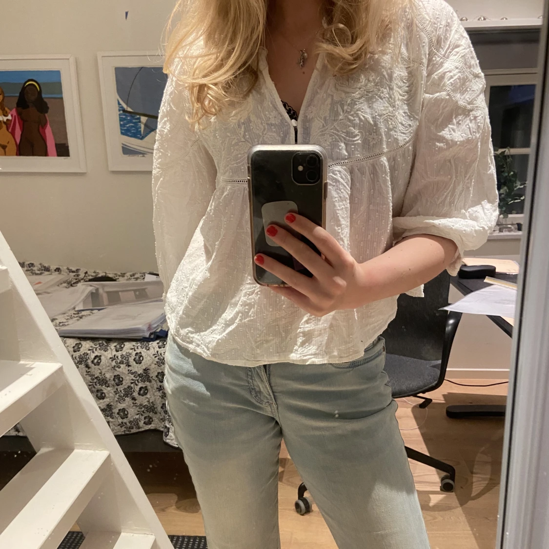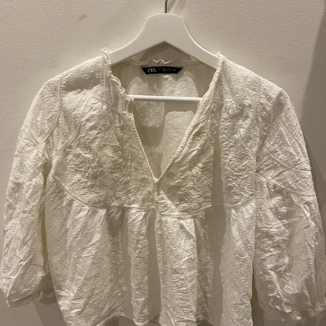 Jätte söt trekvartsärmad blus från Zara. Älskar verkligen detaljerna på bröstet😍 Inga defekter bortsett från att en knapp saknas, därav priset. Använd fåtal gånger. Storlek S men skulle säga att den passar xs-m beroende på hur man vill att den ska sitta!