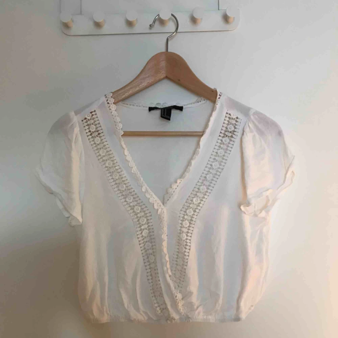 Vit blus med virkade detaljer - aldrig använd. Den är i storlek M och i nyskick, förutom en liten, liten strimma från en bläckpenna som råkat komma åt (se bild 2).