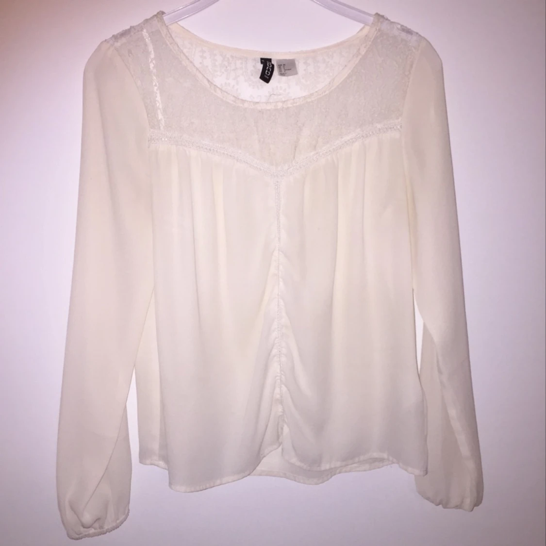 En ljus crémefärgad blus i storlek 36 med spetsdetaljer från HM, mycket bra skick. Köpare står för frakt 🌟