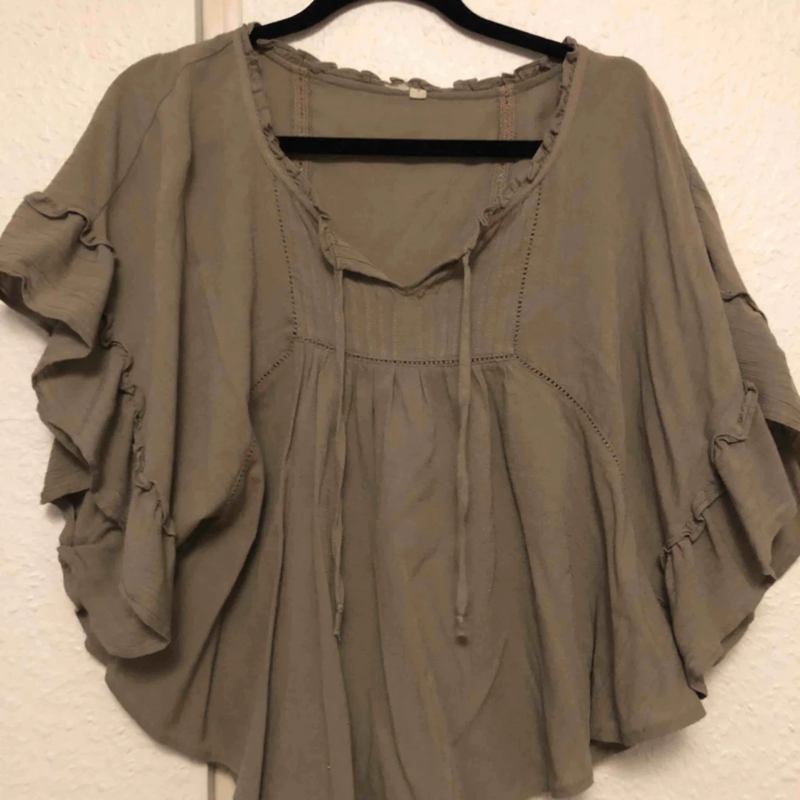 En skönt blus i en gråaktig färg. Blusen är väldigt luftig och behaglig att bära. I fram finns snöre om man vill knyta det vid bröstkorgen. Man kan välja att ha knutet eller låta snörena hänga. Köpare står för frakt.