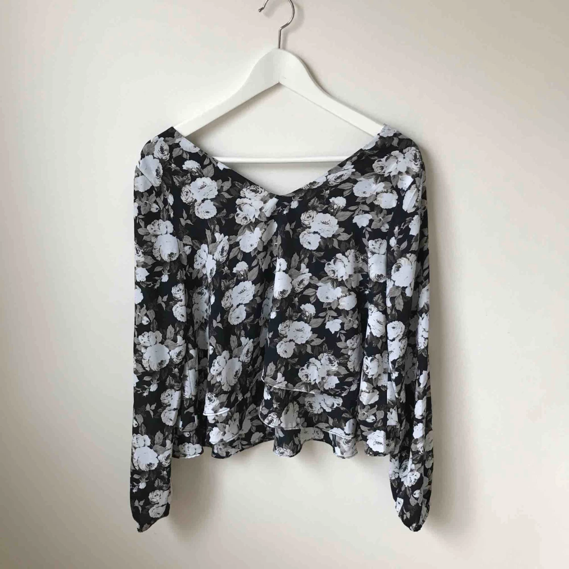 Svart, vit och grå blommig blus med volanger i nyskick. Använd 2 gånger. Köparen står för fraktkostnad enligt postens portotabell.
