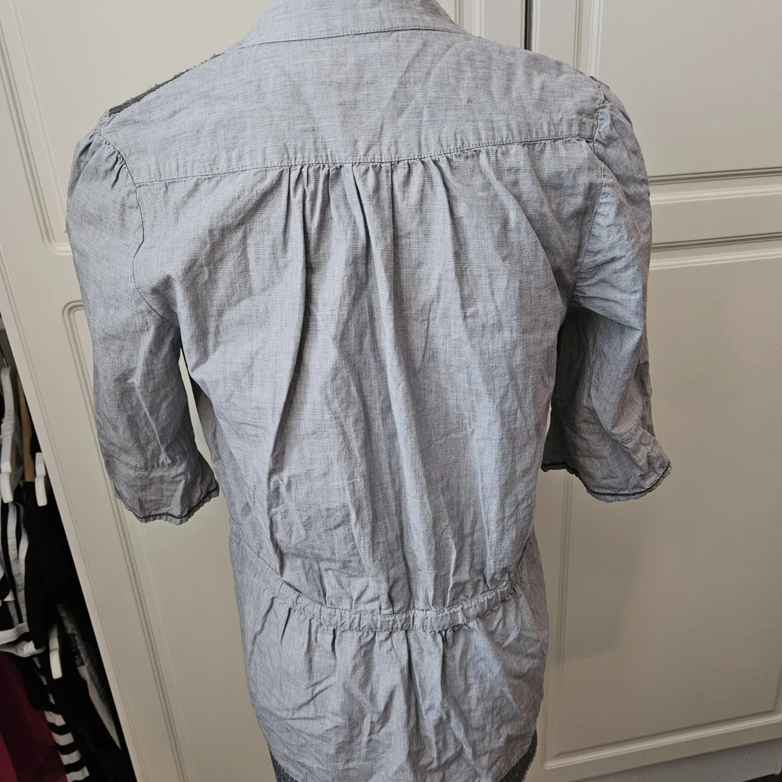 Superfin oanvänd grå blus med knappar, snörning i midjan och trekvartsärm. Strl M