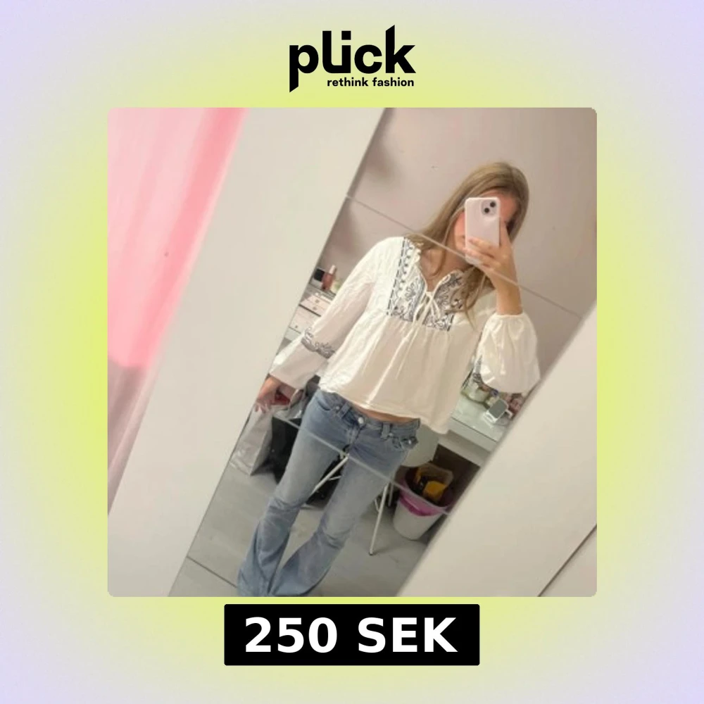 Supersöt vit blus från ONLY med svarta broderier på ärmar och vid halsringningen. Blusen har knytband framtill, v-ringning och vida långa ärmar.
