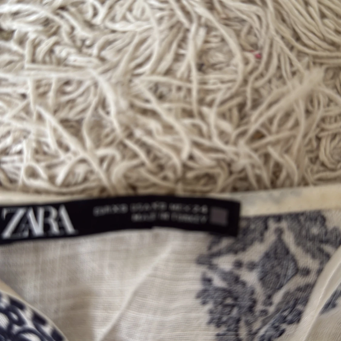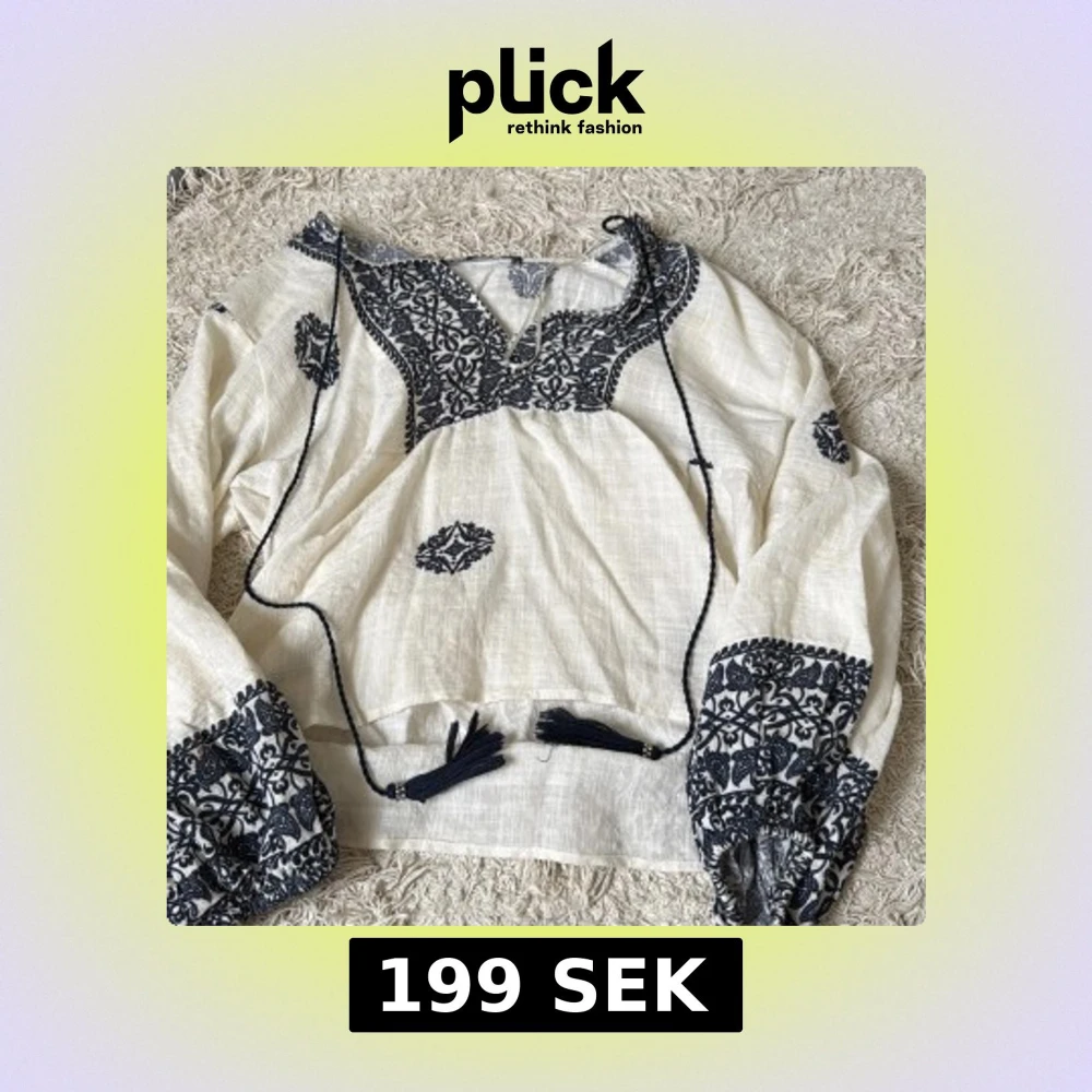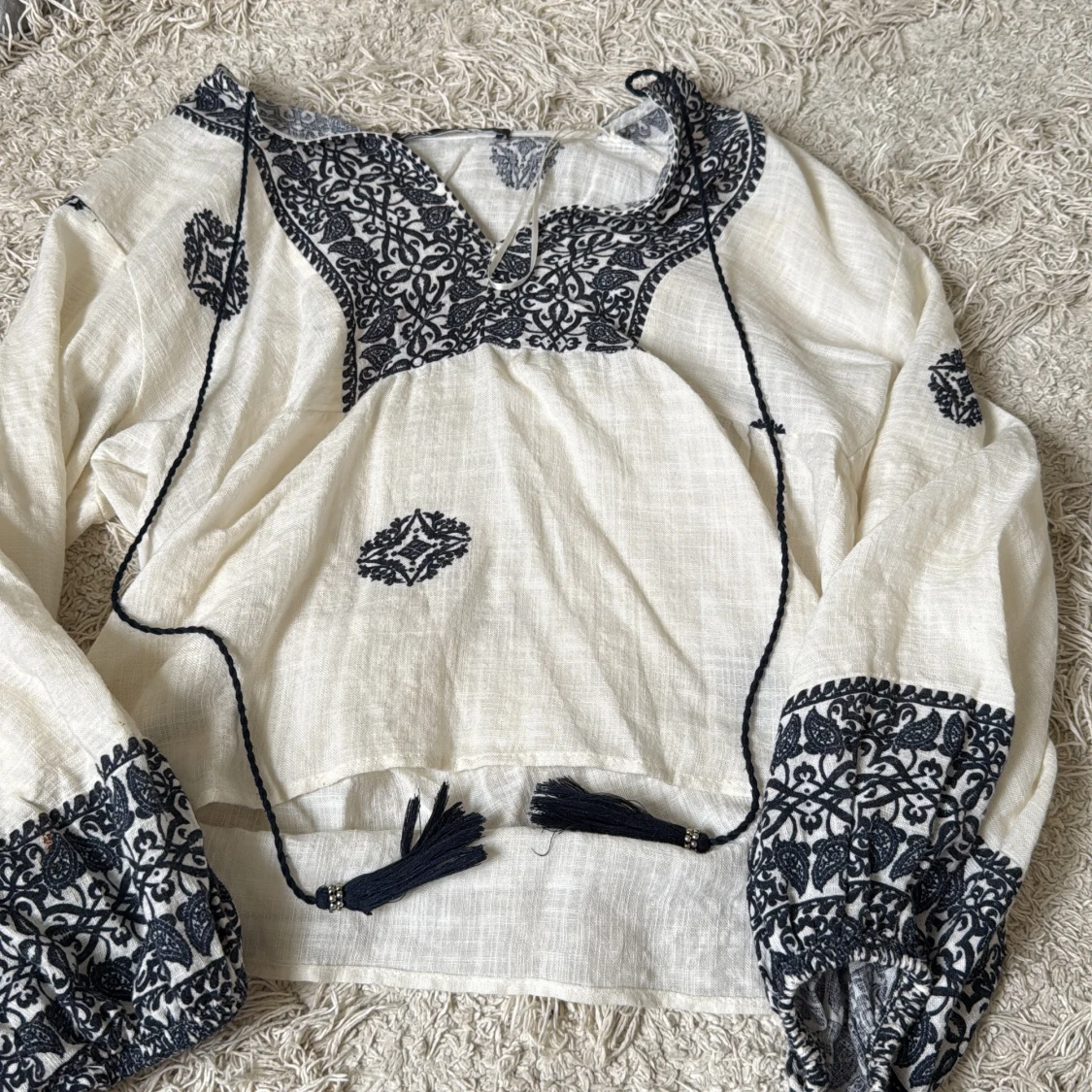 Säljer en superfin vit blus från ZARA med svarta broderade detaljer och snygga knytband med tofsar. Blusen har långärmade puffärmar och v-ringning med broderier längs halsen och ärmsluten. Perfekt för dig som gillar boho-stil! En liten fläck på armen