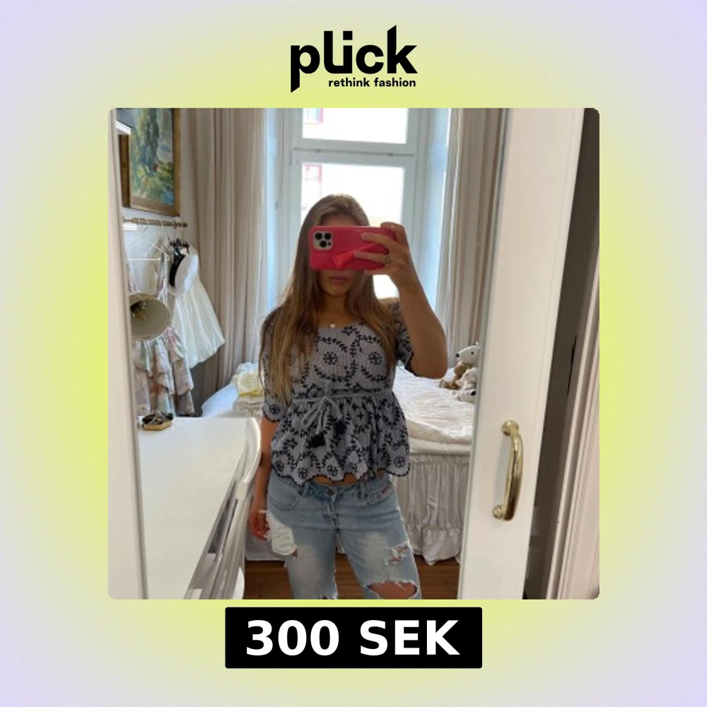 Supersöt blus med broderi. Snörning i midjan som går att byta fram eller bak, V ringad baktill gör även att ha åt andra hållet.