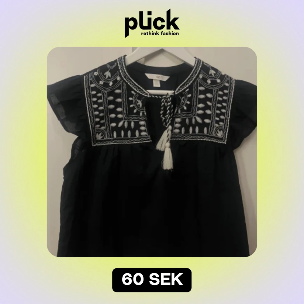 En svart blus från H&M med detaljerad vit brodyr längs bröstet och axlarna. Blusen har korta, luftiga ärmar och knytband framtill med dekorativa tofsar. Perfekt för sommarens varma dagar!