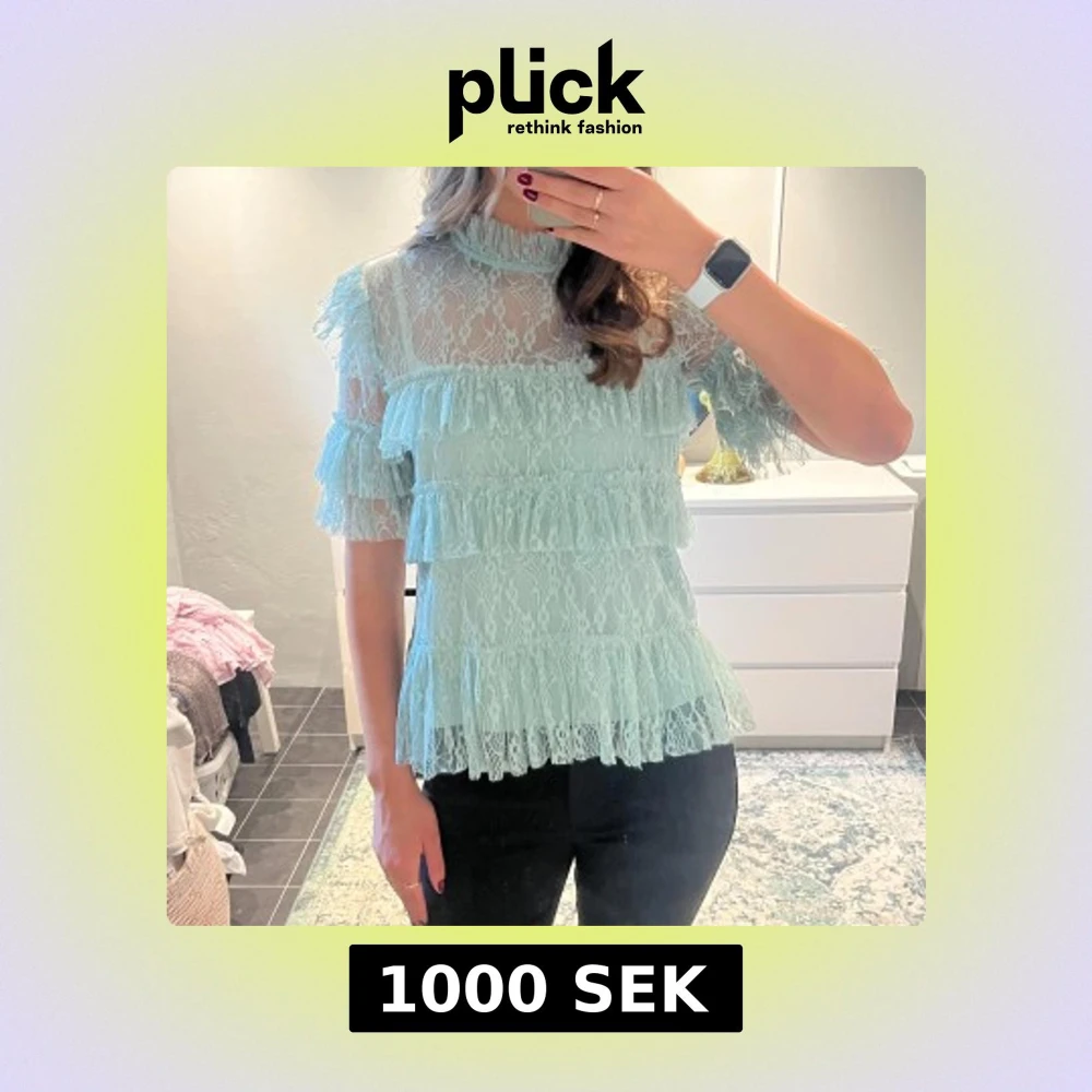 Superfin ljusblå rachel blus från By Malina i spets med volanger och hög hals. Blusen har korta ärmar och är genombruten med flera lager volangdetaljer. Materialet är polyester och den känns både romantisk och trendig.
