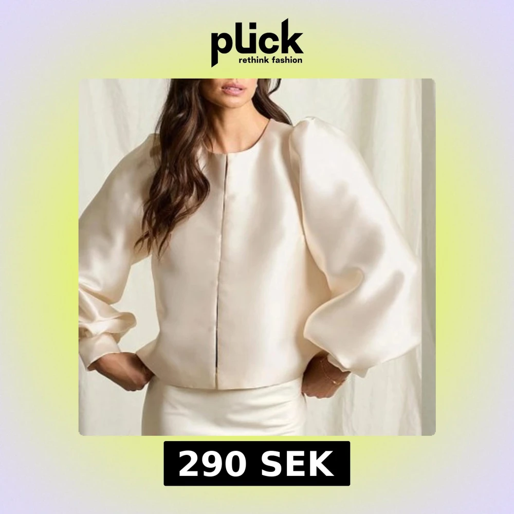 Supersnygg champagnefärgad med puffiga långärmar och rund halsringning. Jackan har knappar framtill och en lyxig, glansig finish som verkligen sticker ut. Perfekt för dig som vill ha något unikt och trendigt.