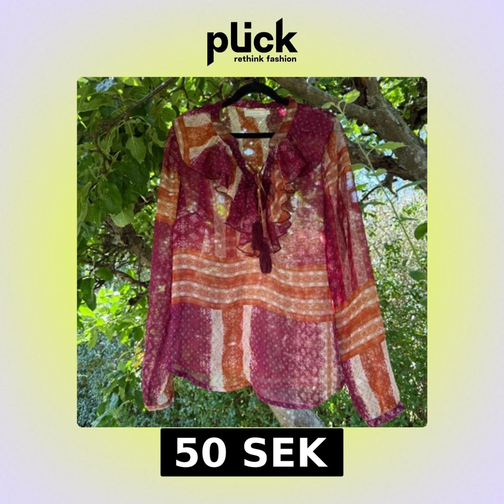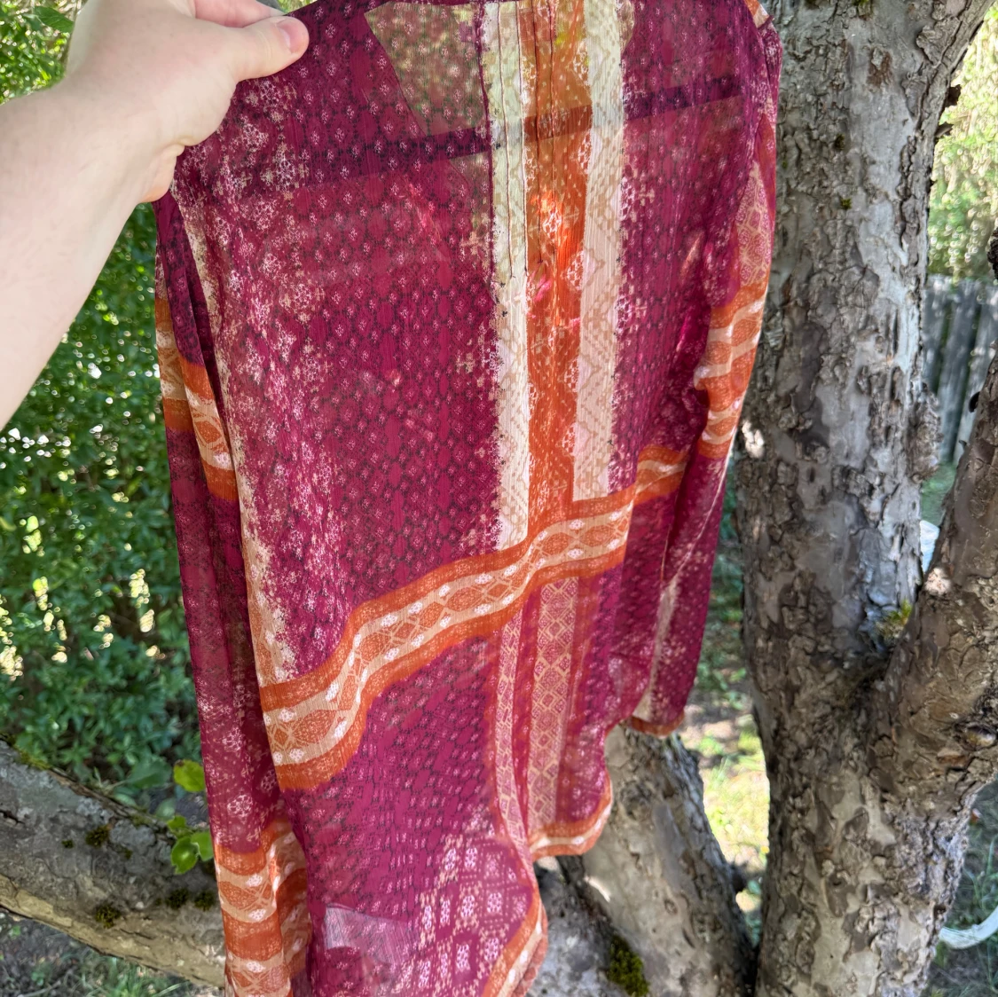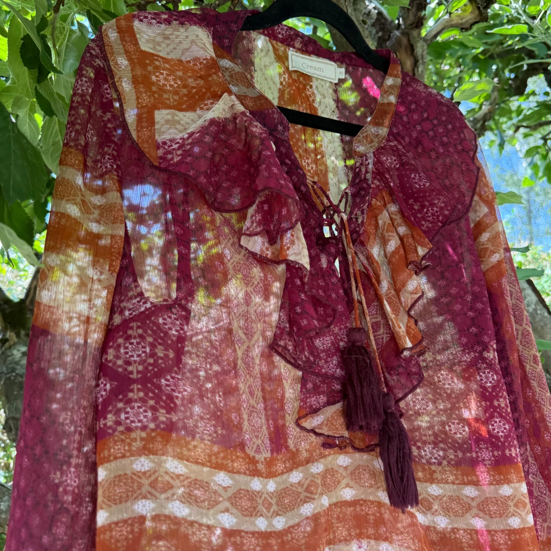 Otroligt vacker blus från märket Cream i storlek 40. Färgen är en superfin mörkare röd men detaljer i orange och beige. Mycket fint skick, jag hittar inga synliga anmärkningar eller defekter. Den kan vara något transparent.