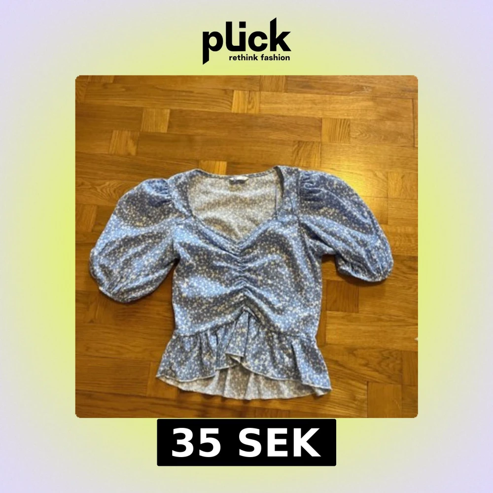 Supersöt blå blommig blus med v-ringning, puffiga trekvartsärmar och volang nertill. Blusen har rynkade detaljer framtill och är perfekt för vår och sommar. Lätt och luftig modell som ger en romantisk känsla.