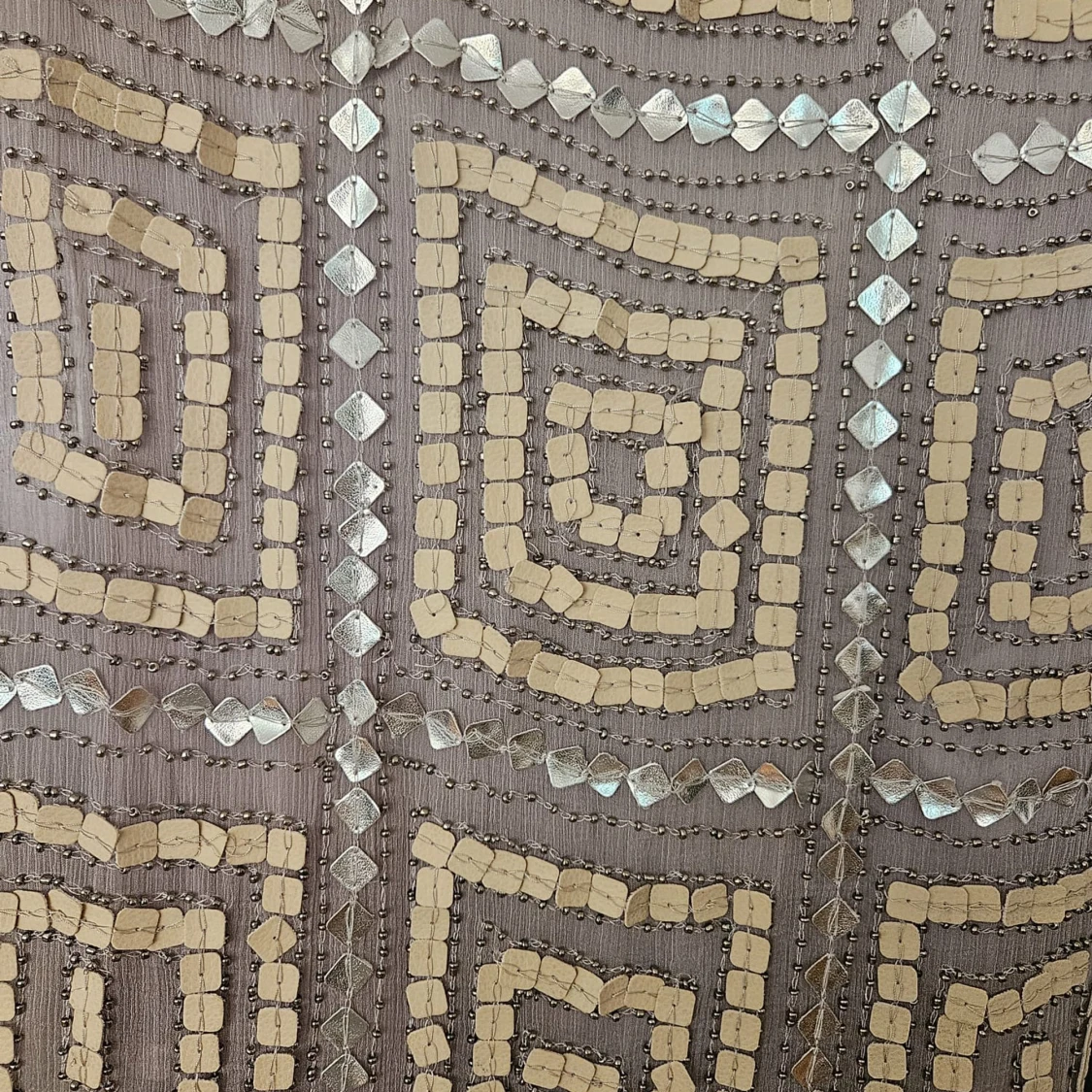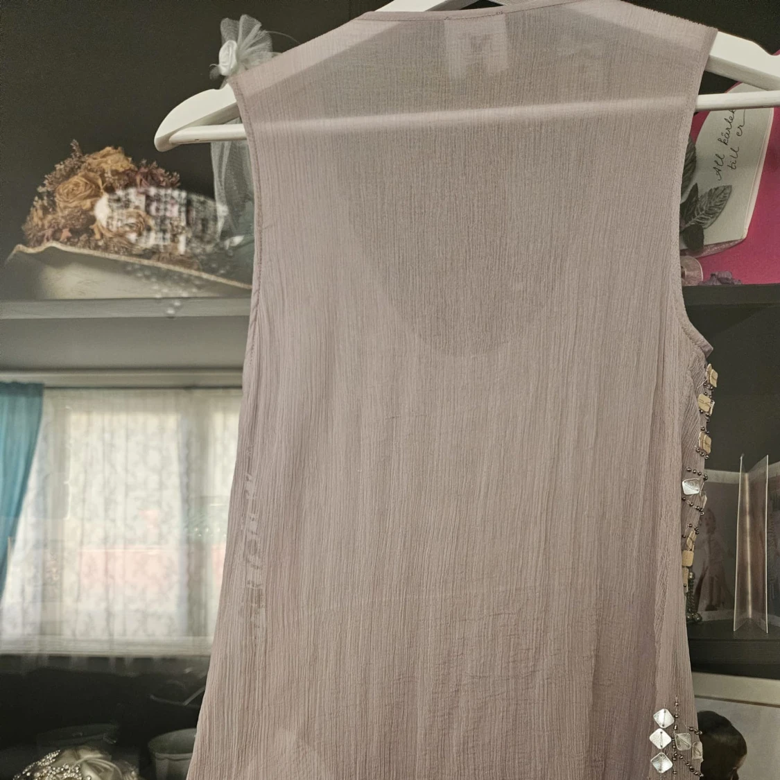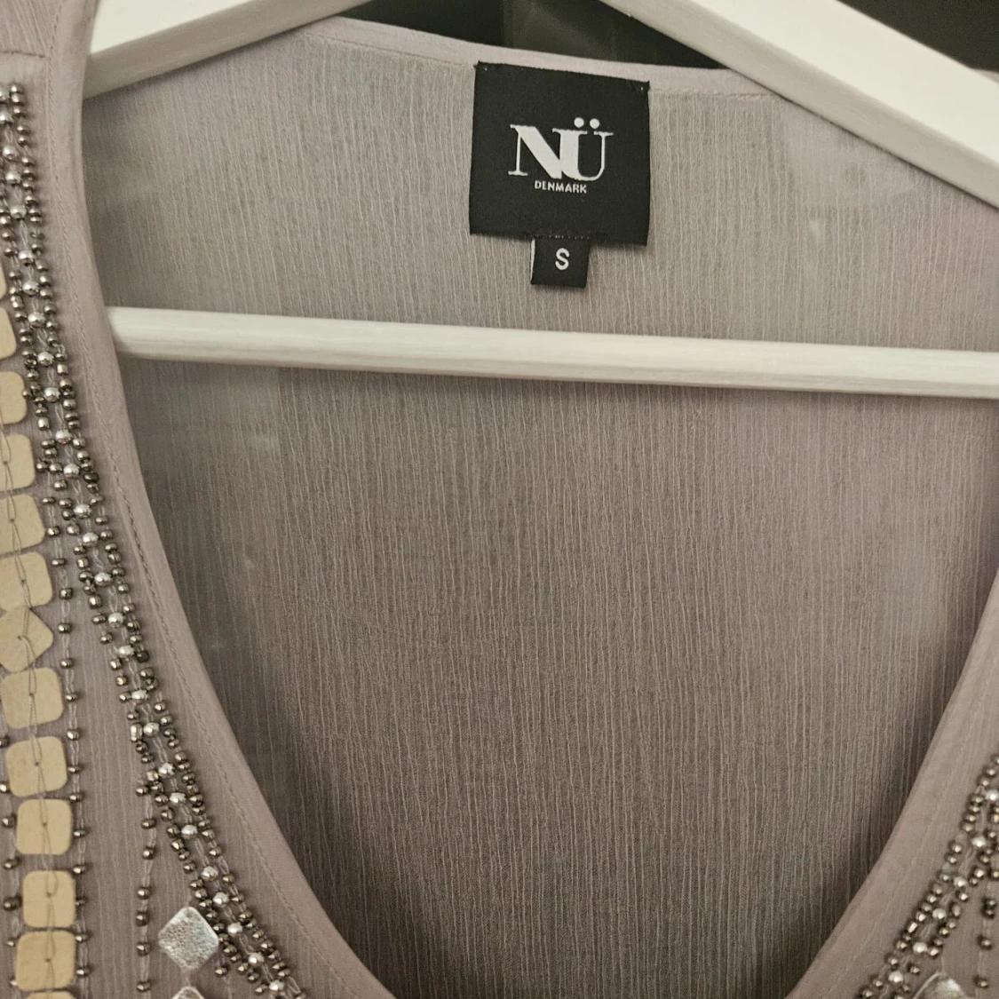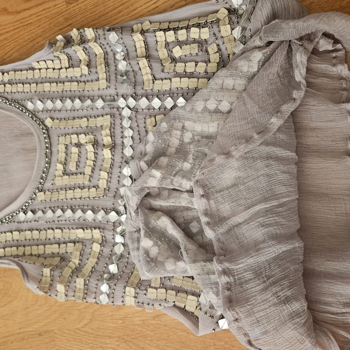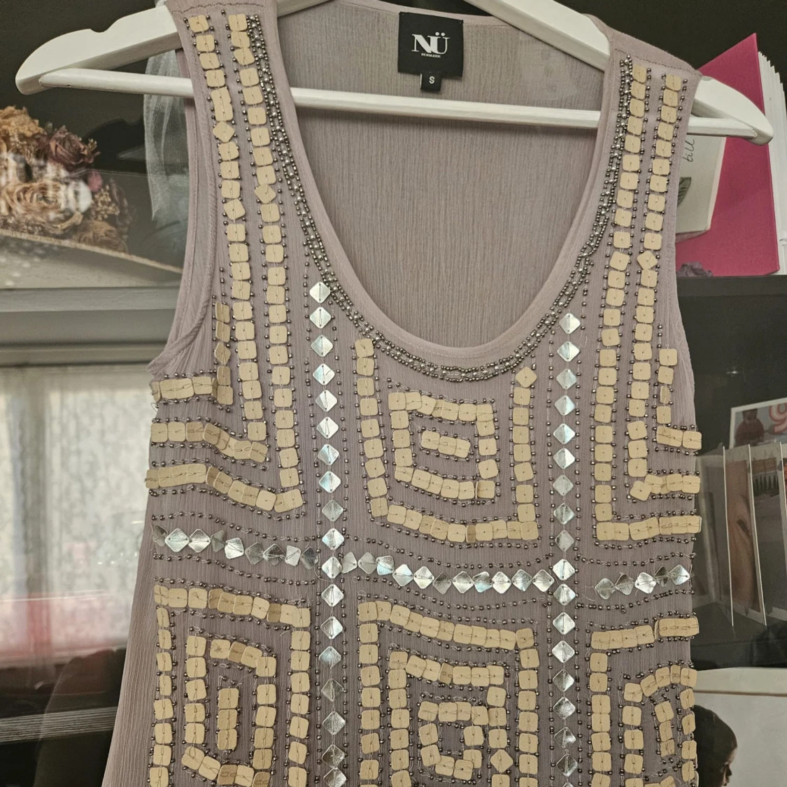 Säljer en ärmlös klänning från NÜ i beige med geometriska mönster av silverfärgade paljetter och pärlor. Klänningen har rund halsringning och är i ett lätt, transparent material. Perfekt för dig som vill sticka ut med snygga detaljer.