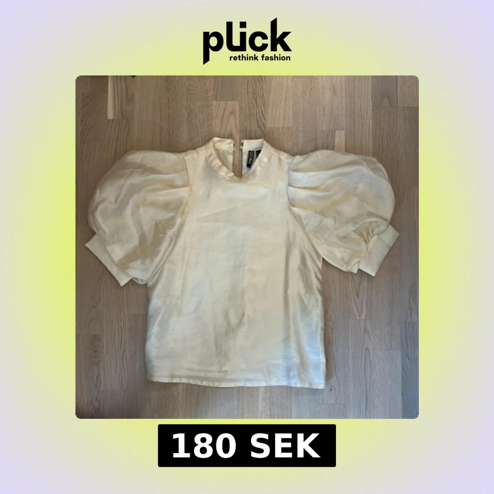 Säljer en krämvit blus från PIECES med stora puffärmar. Blusen har knäppning i nacken och är tillverkad i ett glansigt material. Storlek s, köparen står för frakt🩷