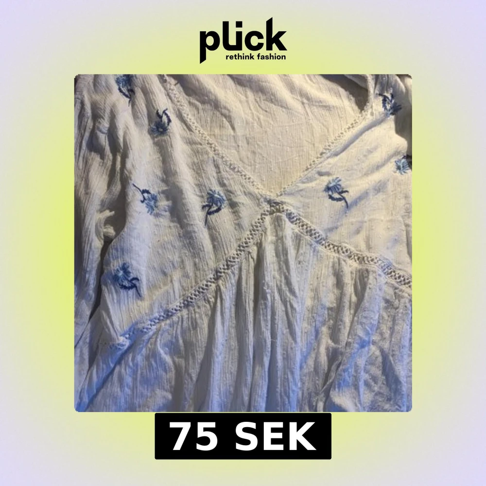 Söt vit blus från Flash Woman i storlek XL. Blusen har blå broderade blommor, v-ringning och spetsdetaljer. Tillverkad i ett lätt bomullstyg med struktur och små prickar i tyget. Perfekt för varma dagar! Obs! Blusen har 3 små hål som går enkelt att laga!!