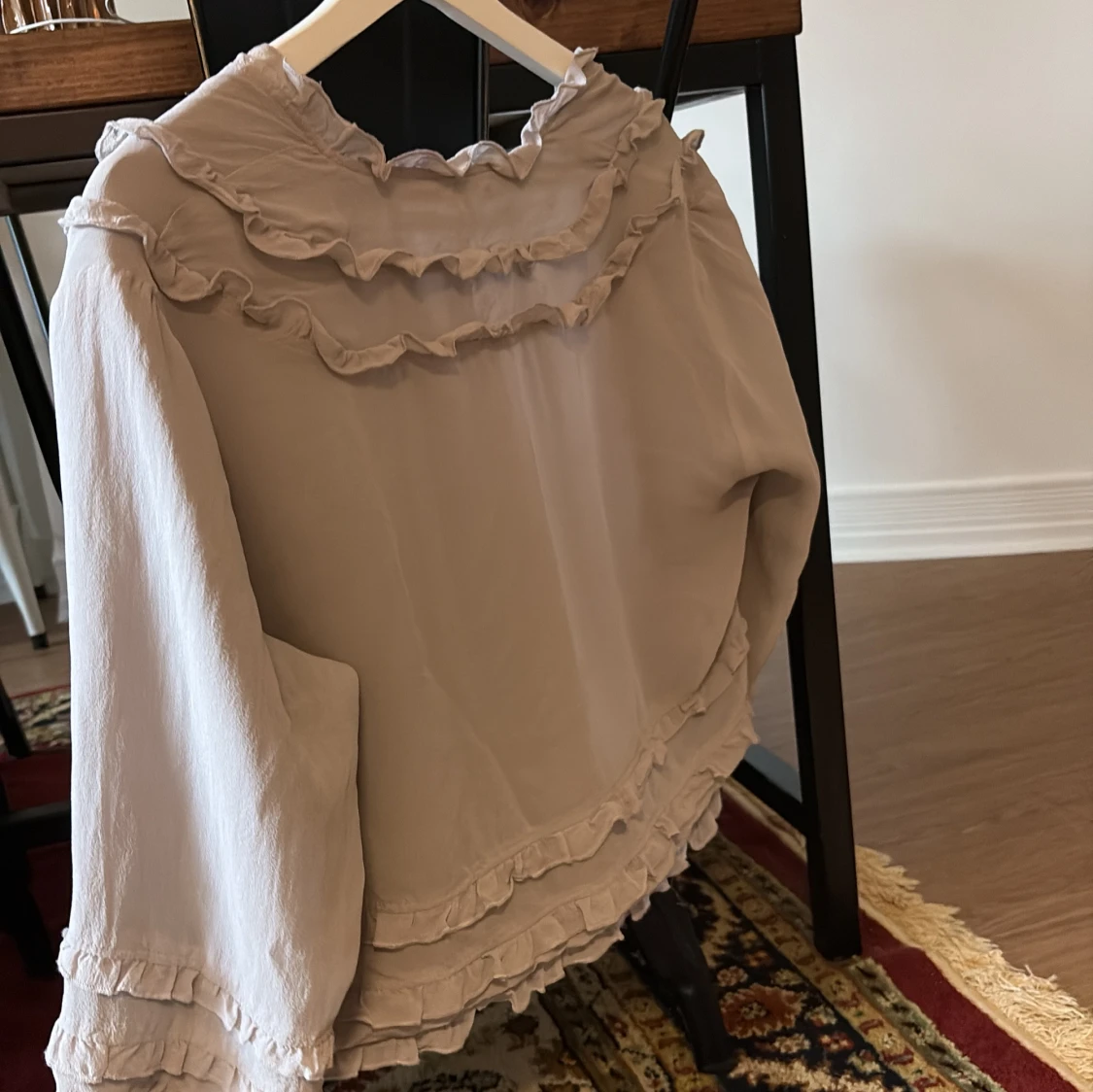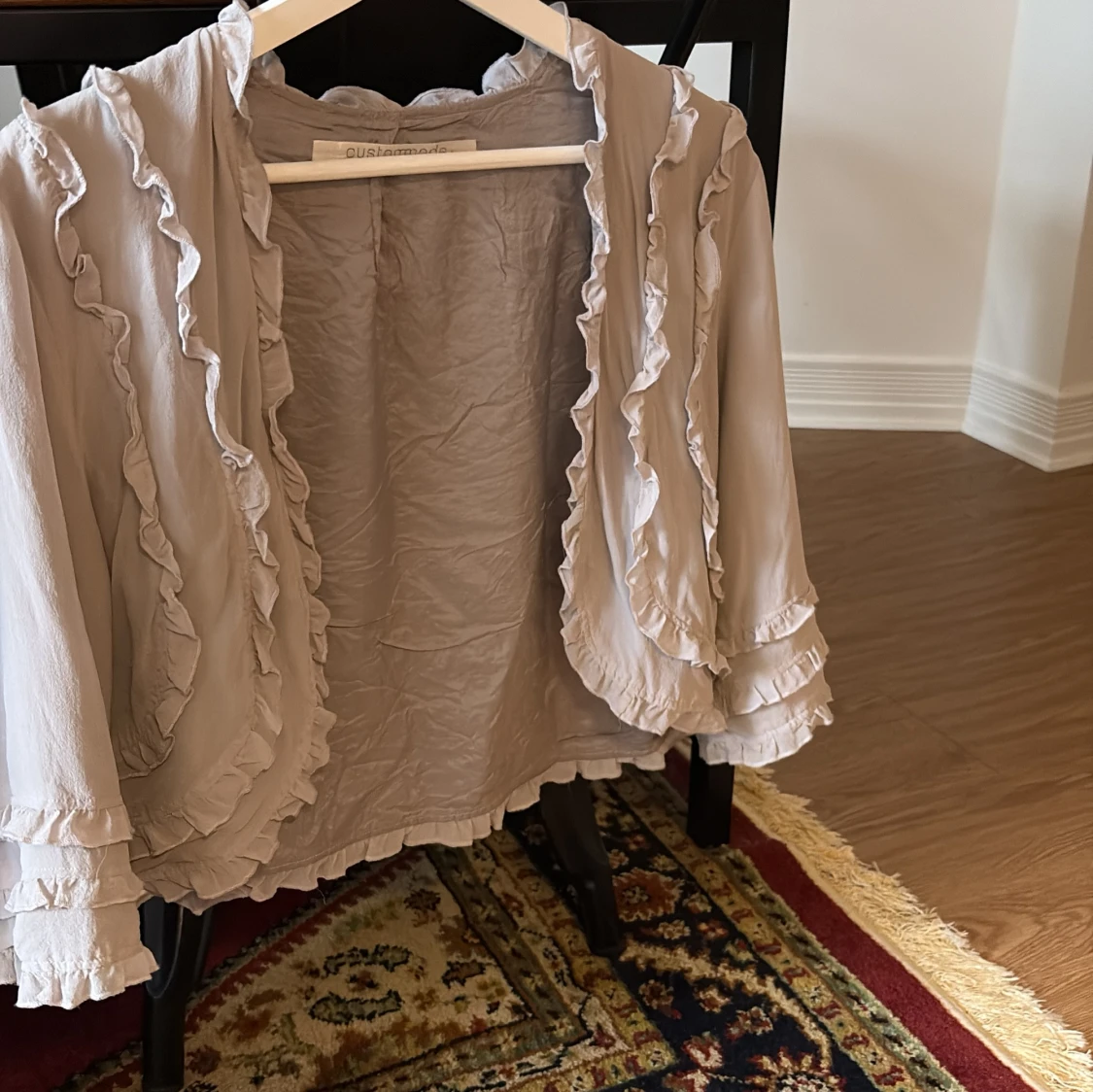 Supersöt bolero med volangdetaljer längs kanterna och ärmsluten. Boleron har en lös passform och är tillverkad i silke. Perfekt att slänga över en topp för en extra touch till outfiten. Första bilden är lånad! Köpt på plick men endast använd en gång, inga defekter