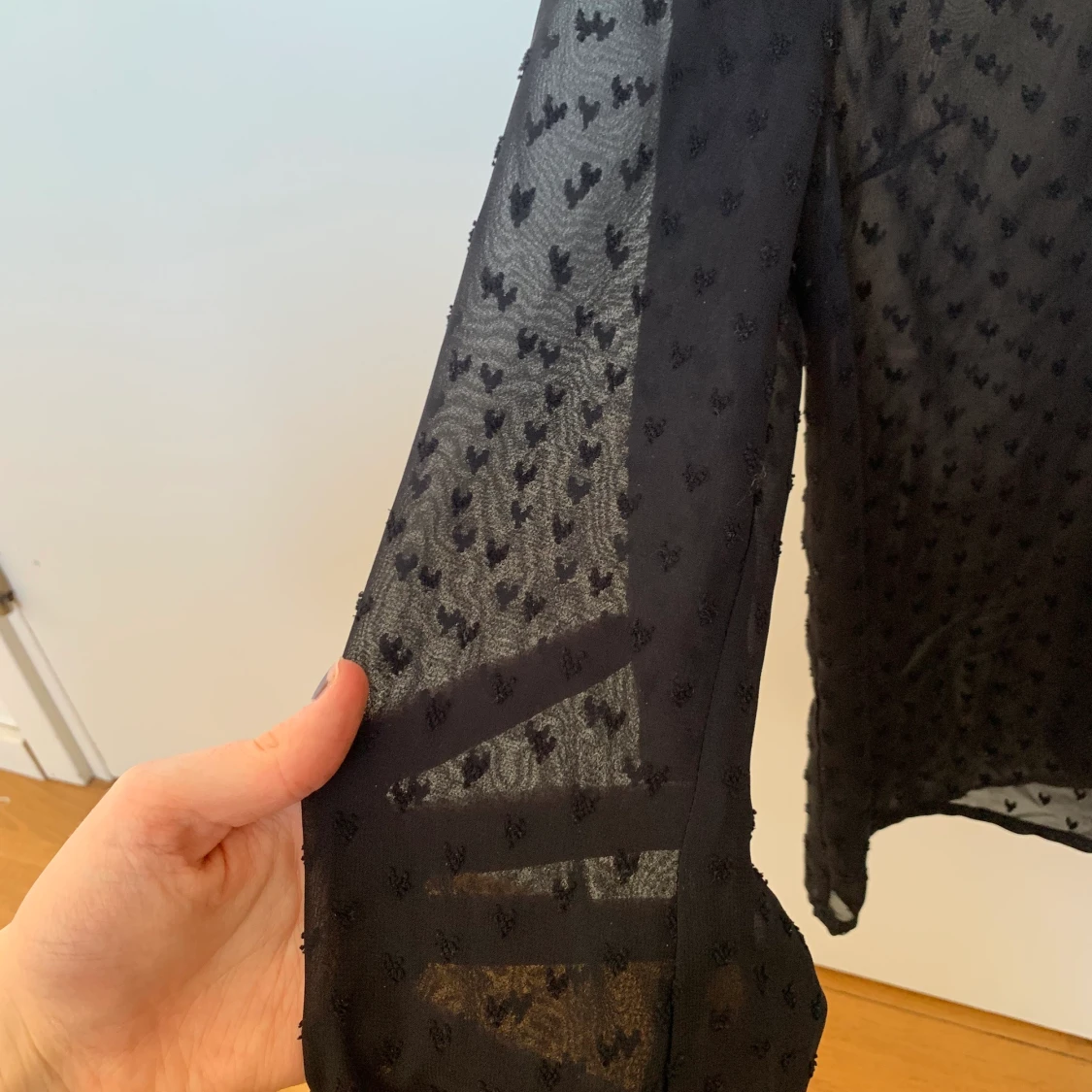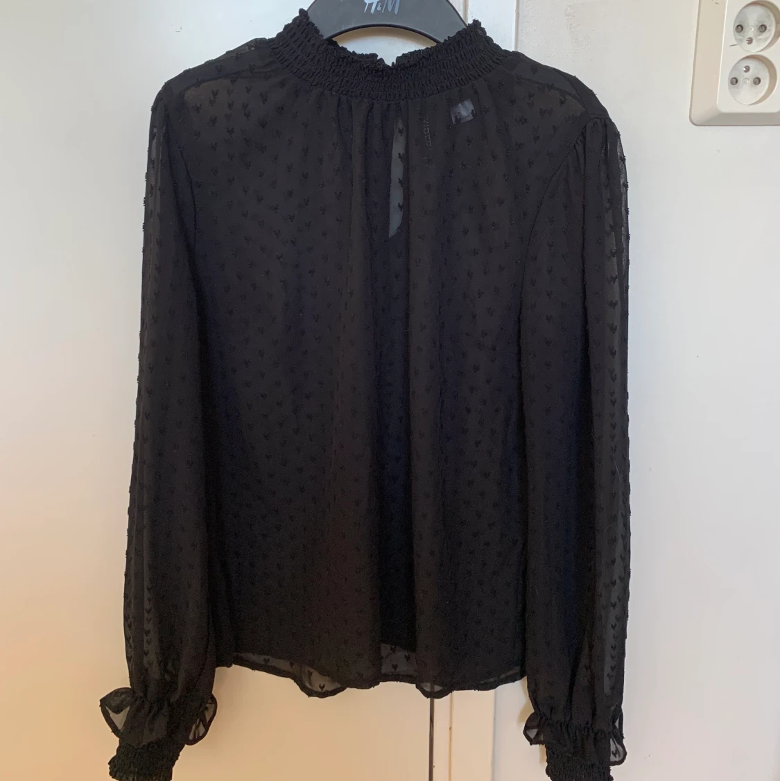 En långärmad svart blus med hög krage, väldigt söt! Tunnt material med fina inbroderade hjärtan i tyget! För liten för mig