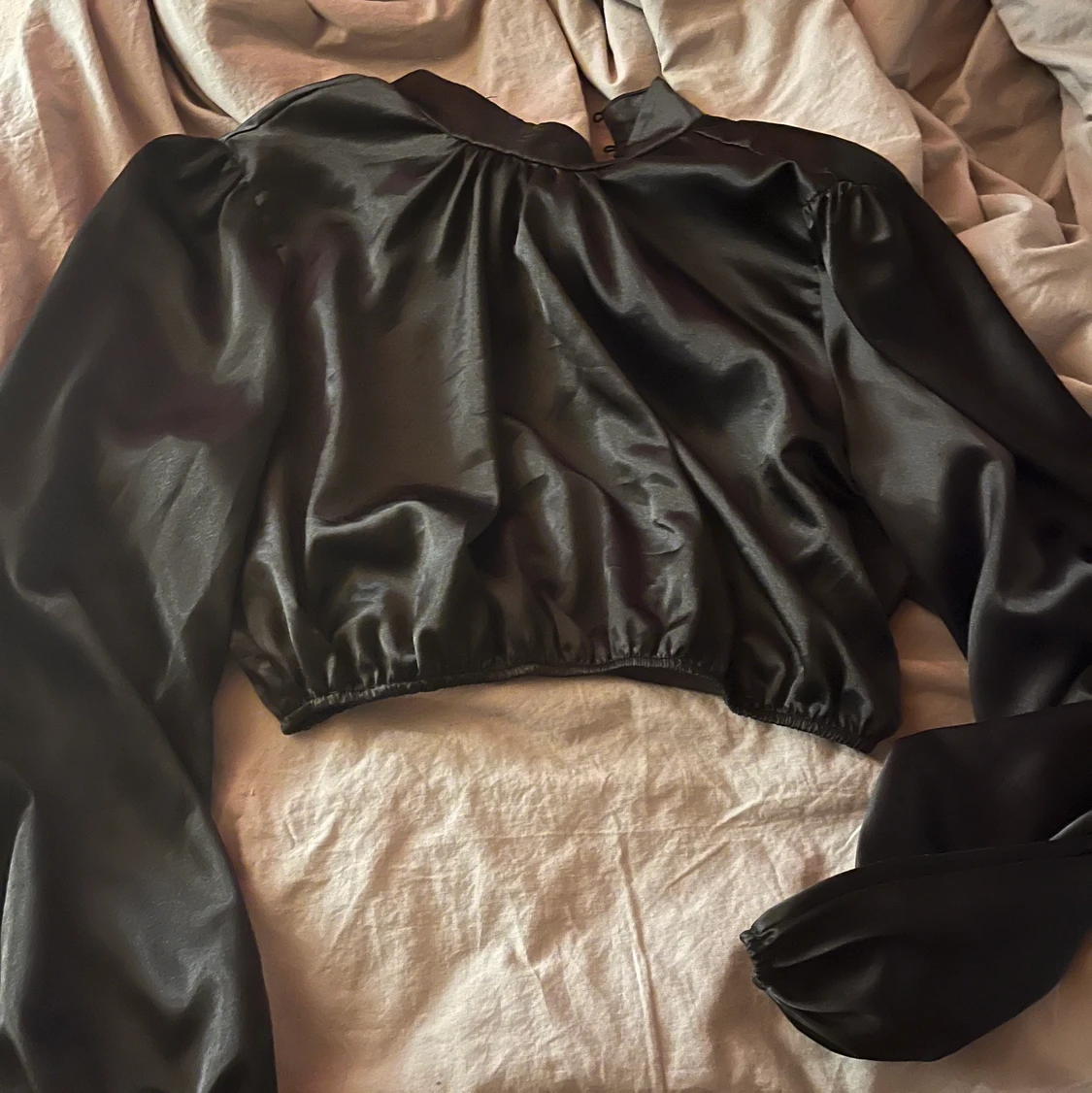 Svart fest topp i croppat och puffiga armar i satin, super fin toppledare lite högre krage. Använd 2 gånger så i fint skick🤍