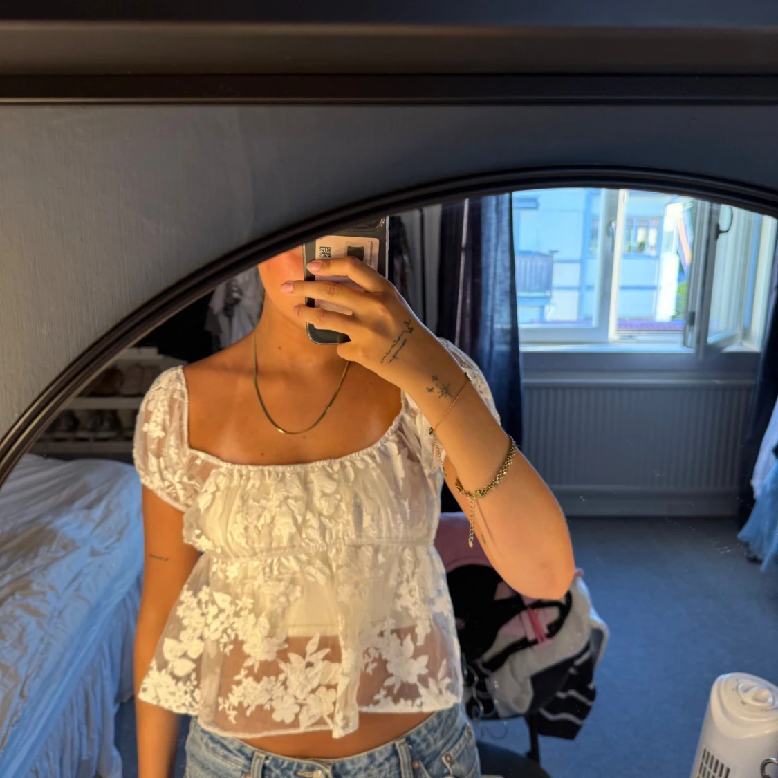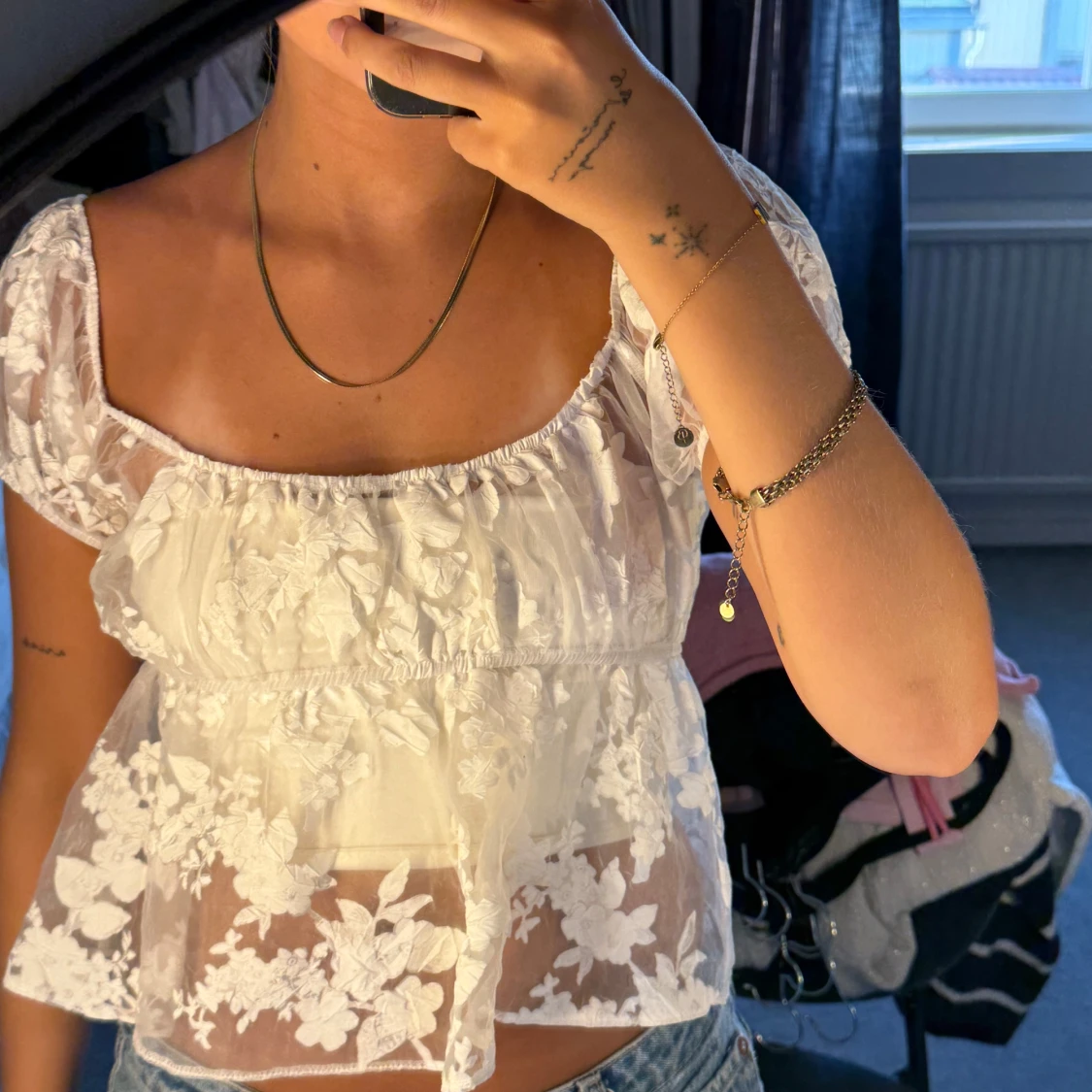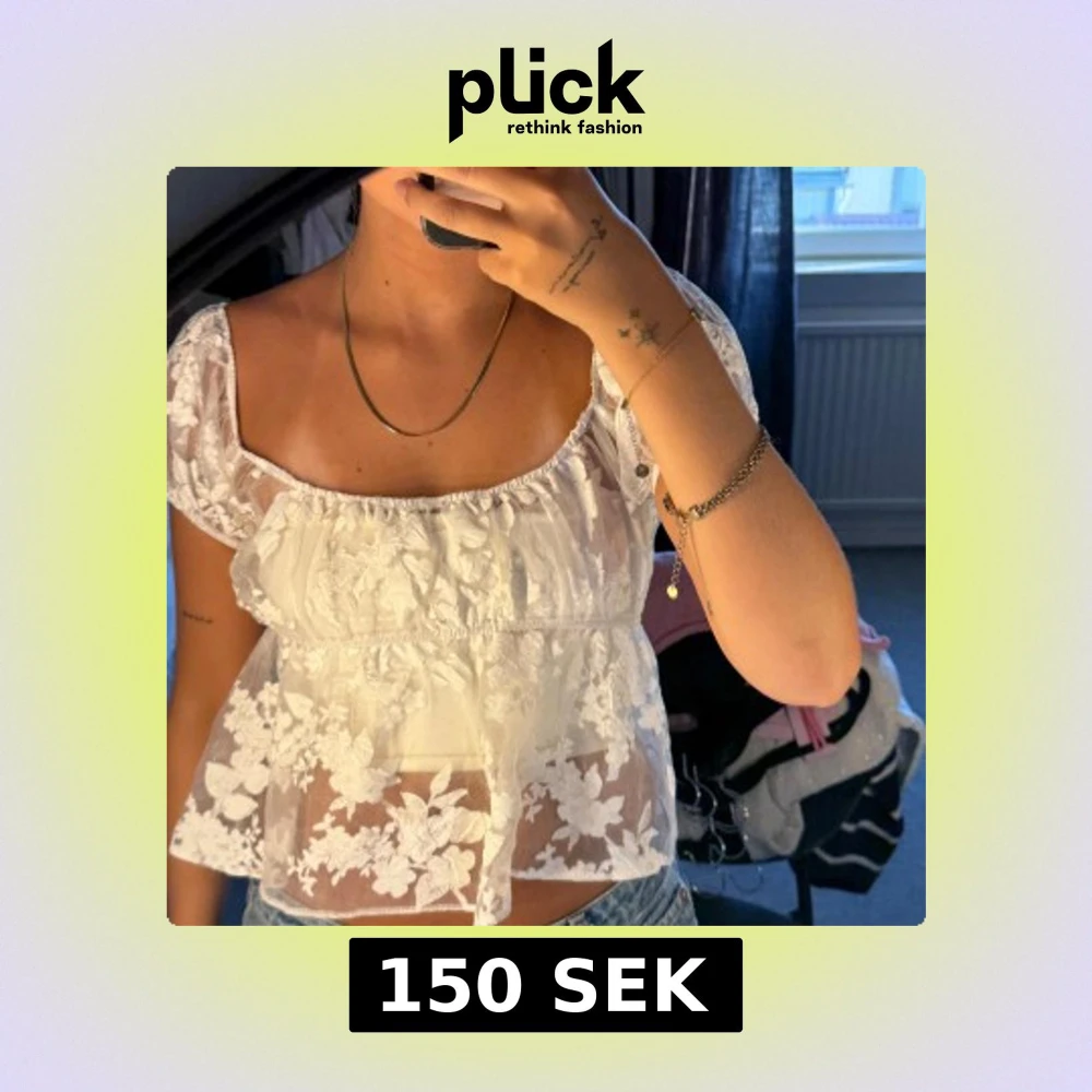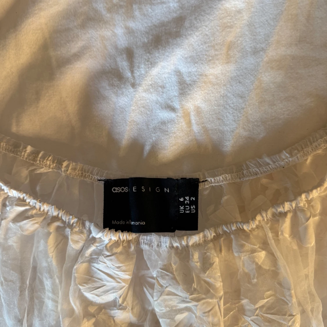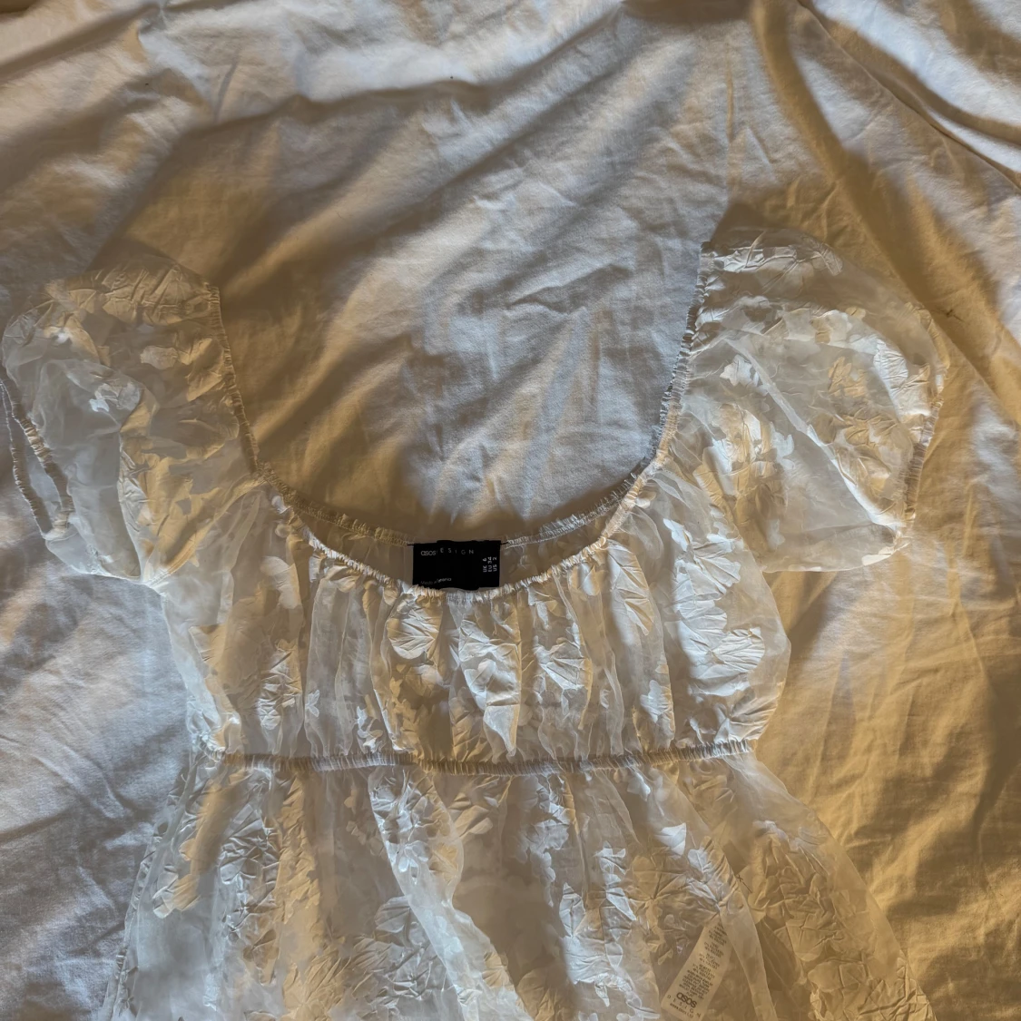 Superfin vit blus från ASOS DESIGN i storlek 34. Blusen är transparent med blommigt mönster, har puffiga korta ärmar och en söt volang nedtill. Perfekt för dig som gillar romantisk och trendig stil! Sällan använts