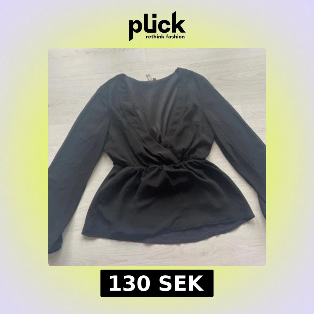 Snygg svart omlott topp, är lite mer ”genomskinlig” vid ärmarna och är urringad med stretchband i midjan.