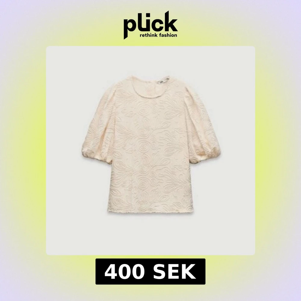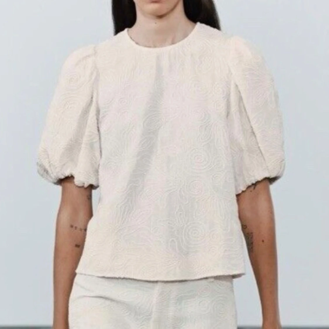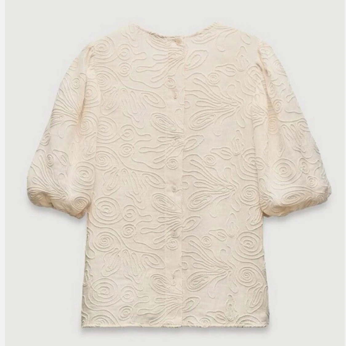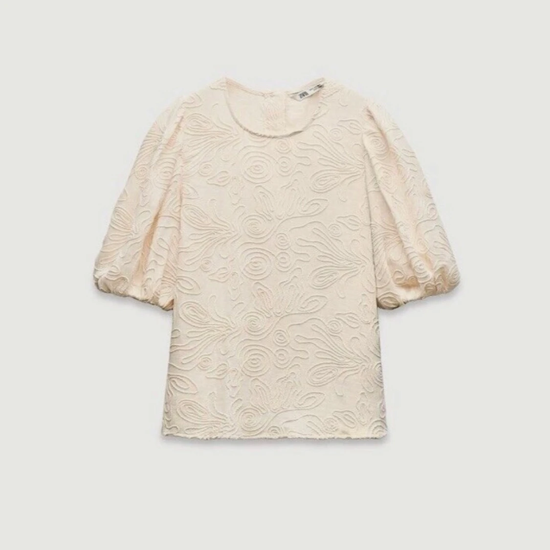 Superfin beige blus från Zara med puffiga ärmar. Blusen har broderat mönster över hela tyget. Jättefin både till vardags och att klä upp till fest eller middag.