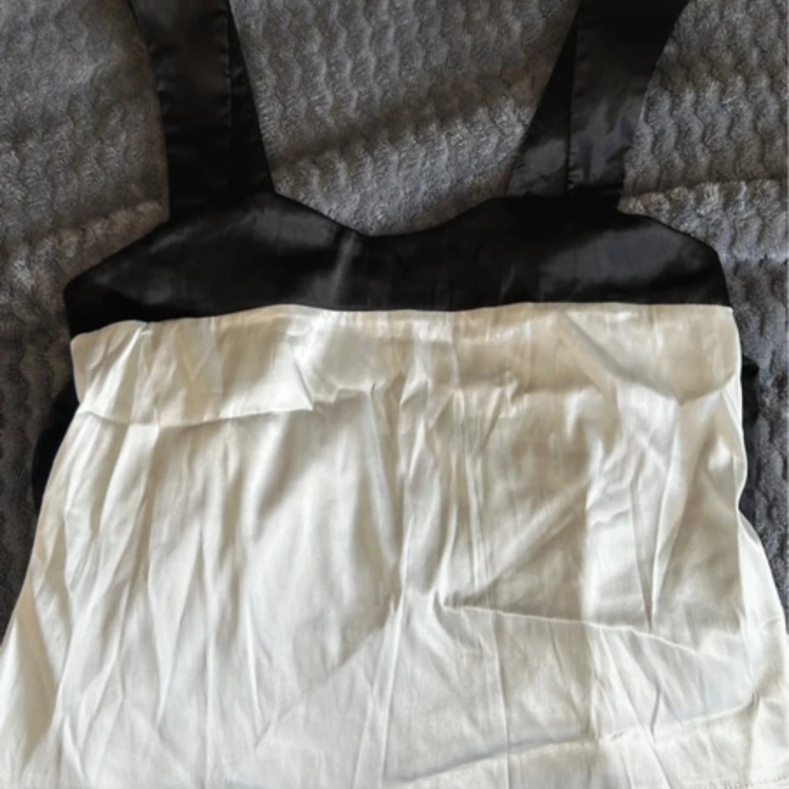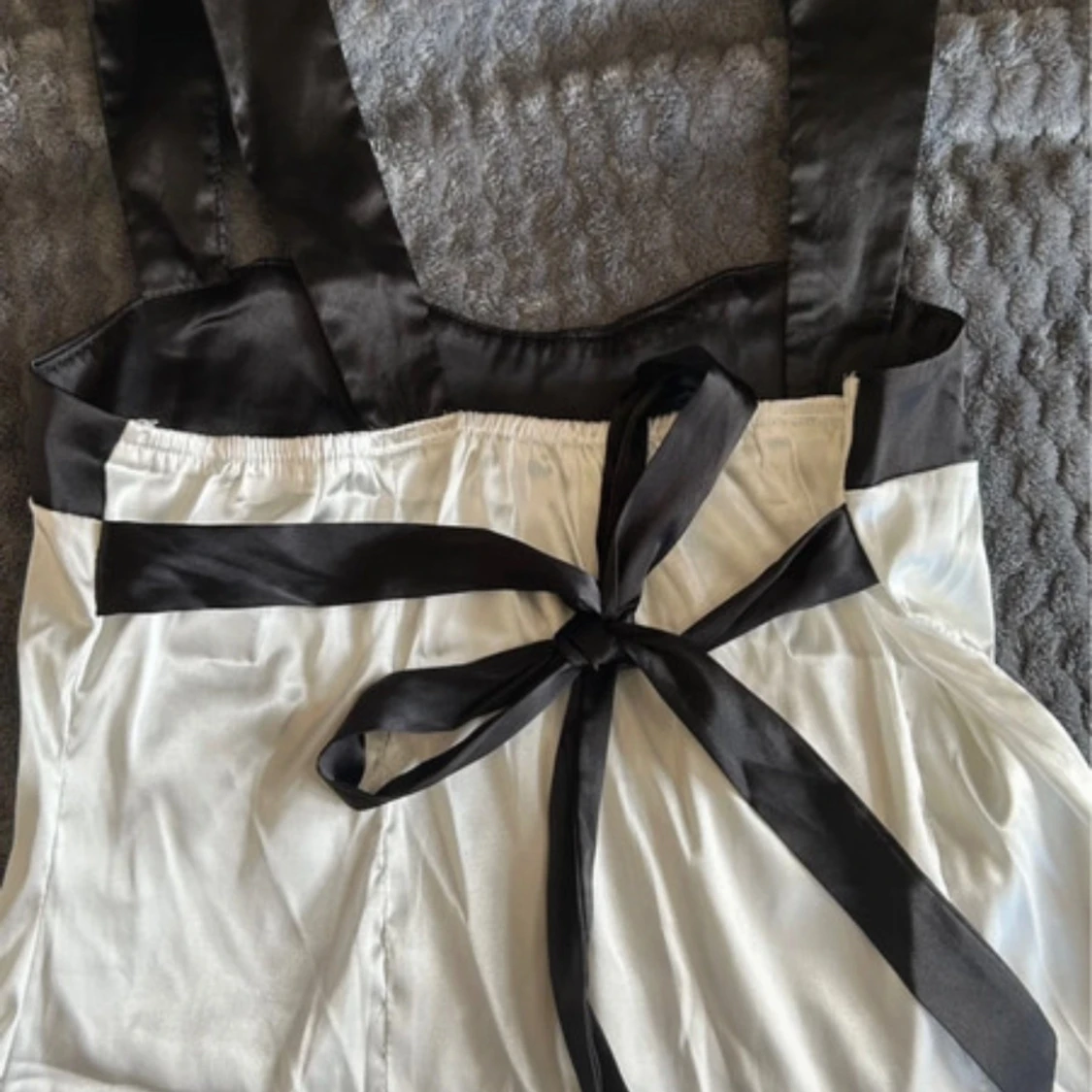 Snygg svartvit topp i satin med breda axelband och fyrkantig urringning. Toppen har en svart rosett baktill som ger en extra touch. Materialet är glansigt och känns lyxigt mot huden. Perfekt för dig som gillar stilrena kontraster och vill sticka ut. Använd 1 gång så mycket bra skick 💗