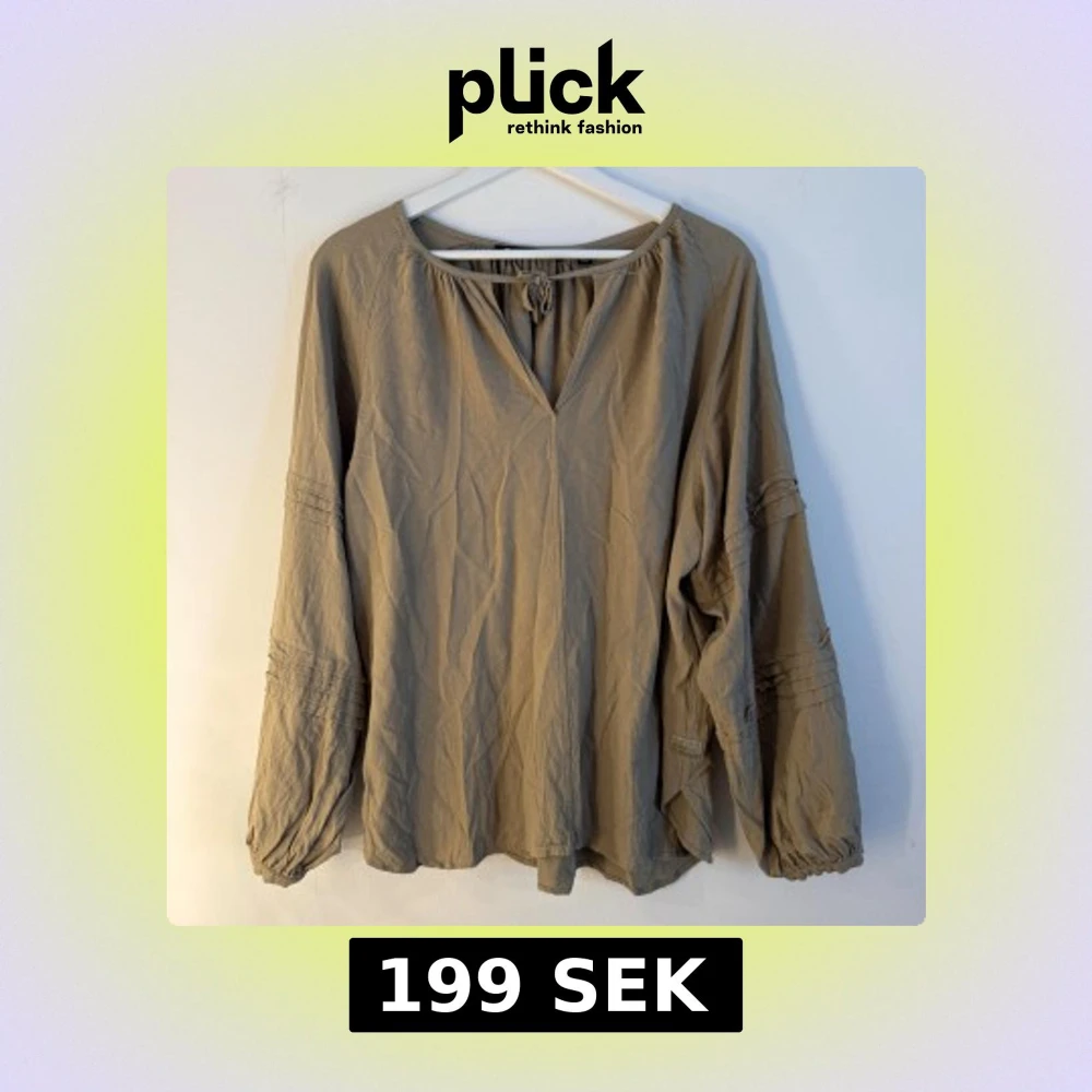 Långärmad blus i en khaki färg med v-ringning och detaljer på ärmarna. Blusen har en avslappnad passform och en knytdetalj vid halsen. Storlek L