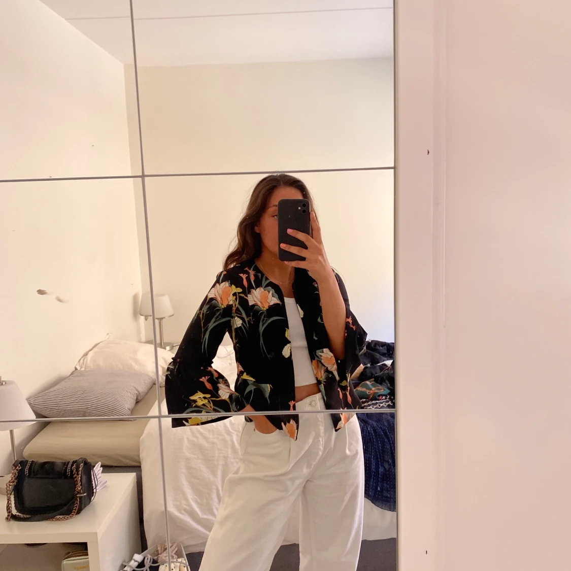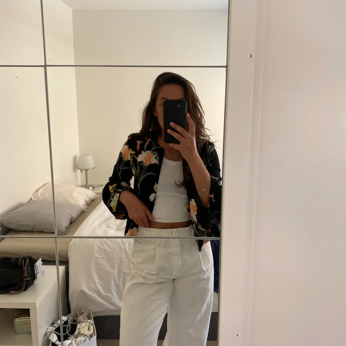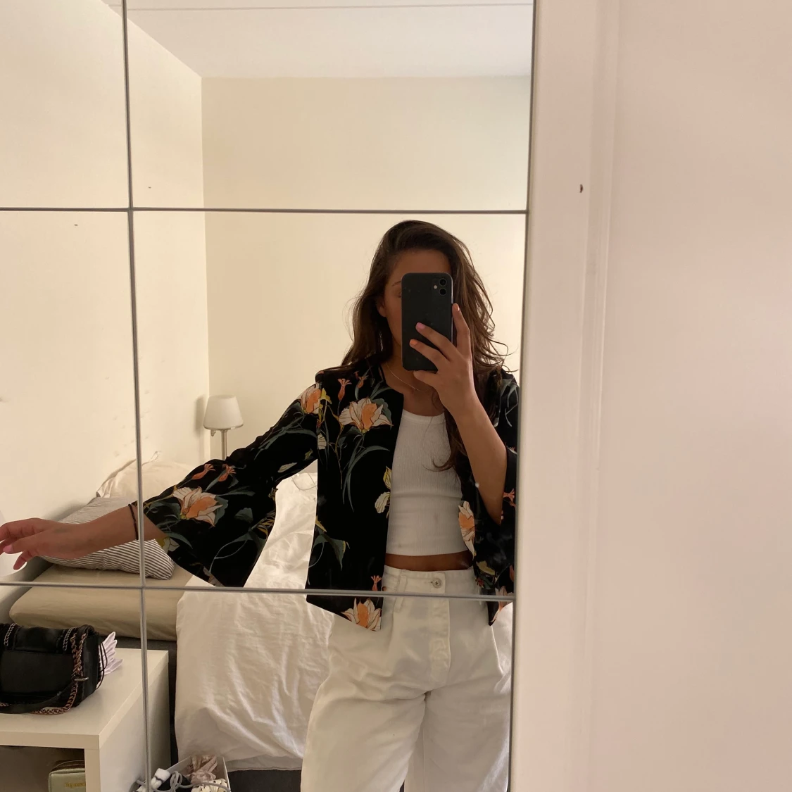Svart med blommigt mönster, armarna har en liten puff/ volang som ni ser på bild 1. Nytt skick, använt 1 gång.