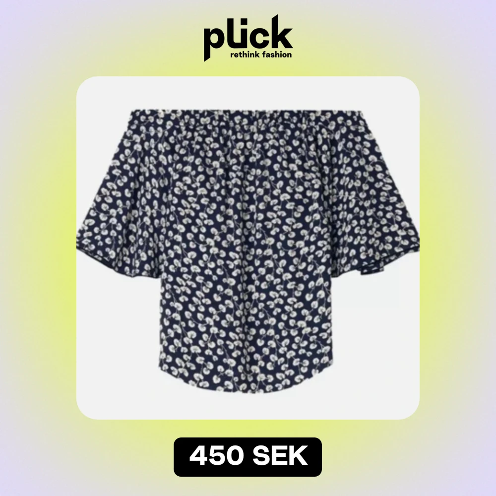 Fantastisk off-shouldertop från Ganni, stl 42. Modell Roseburg crêpe. Mörkt, mörkt blå med vita detaljer. I mkt gott skick.