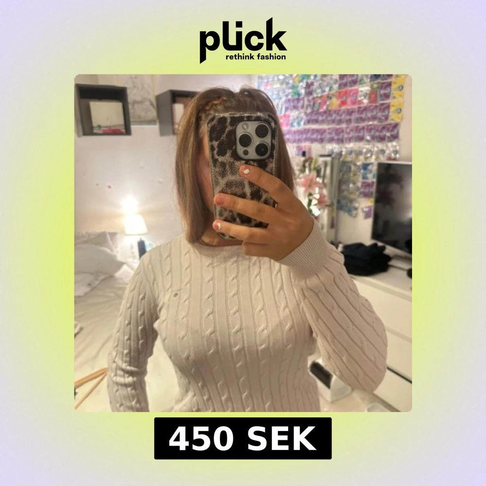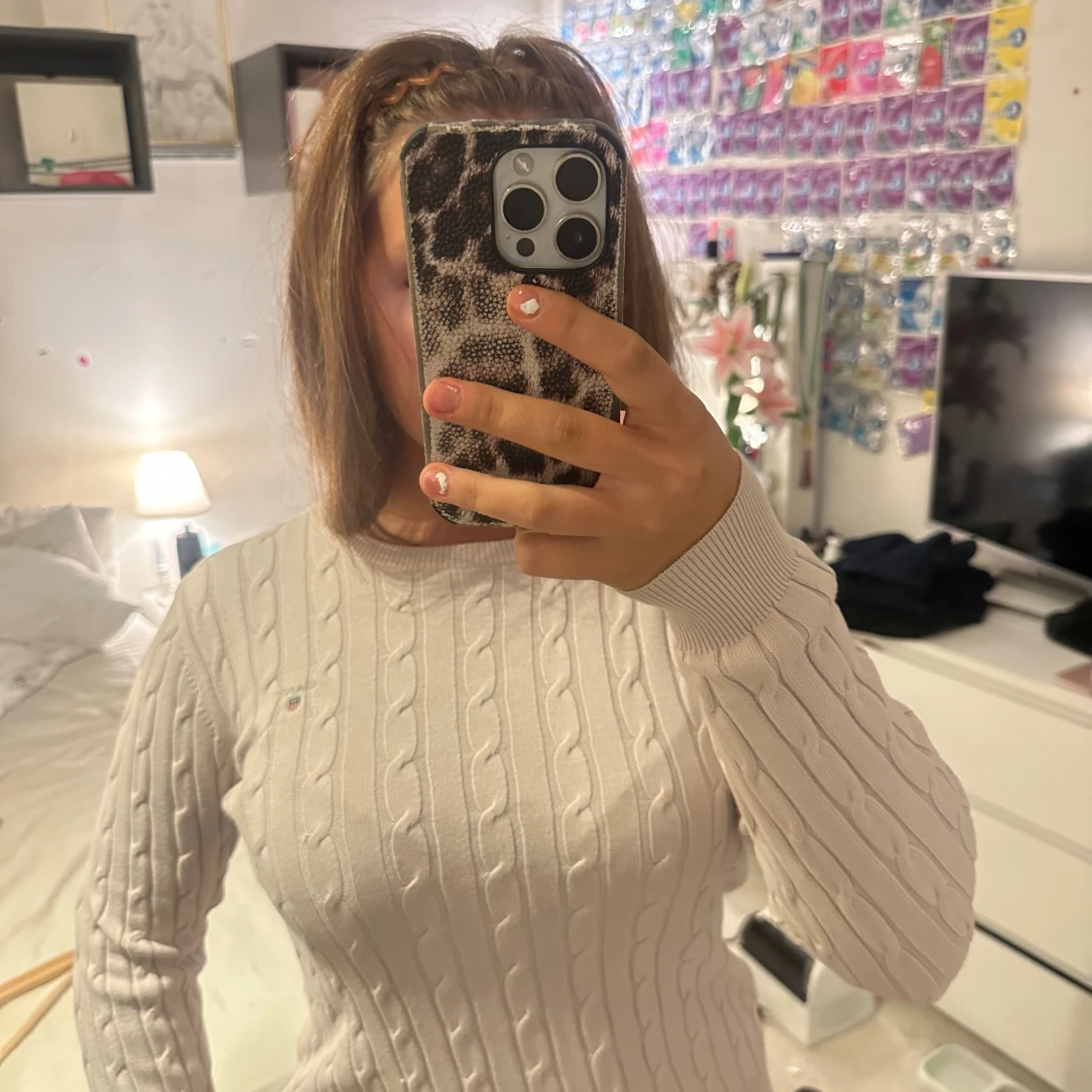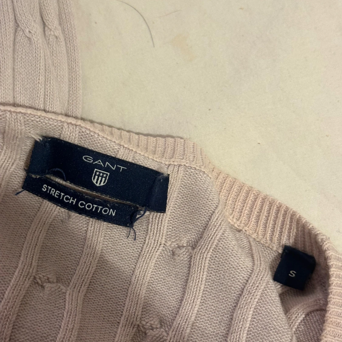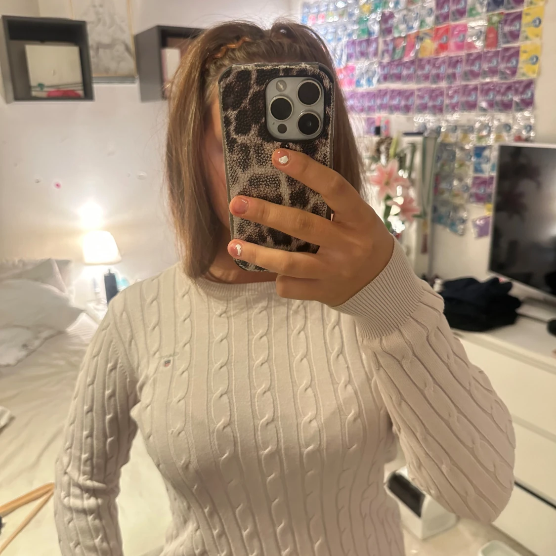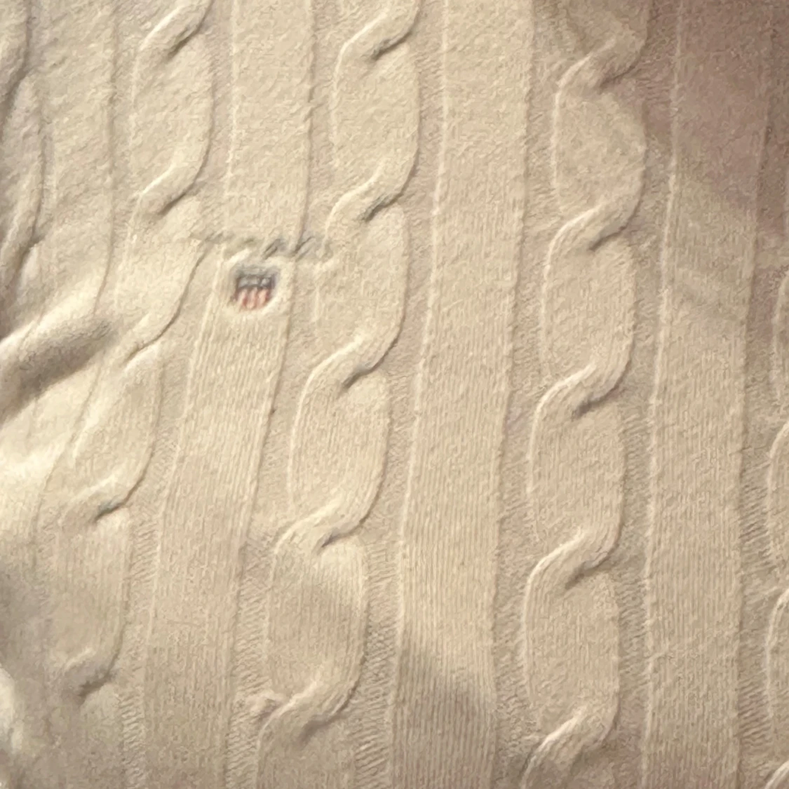 Säljer en klassisk vit kabelstickad tröja från Gant i stretchig bomull. Tröjan har rund halsringning, ribbade muddar och Gant-logga broderad på bröstet. Perfekt för dig som gillar en stilren och tidlös look. Tröjan är äkta!!