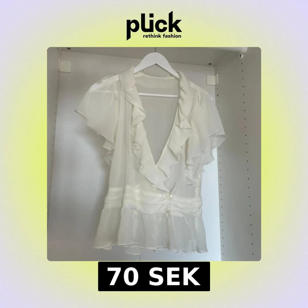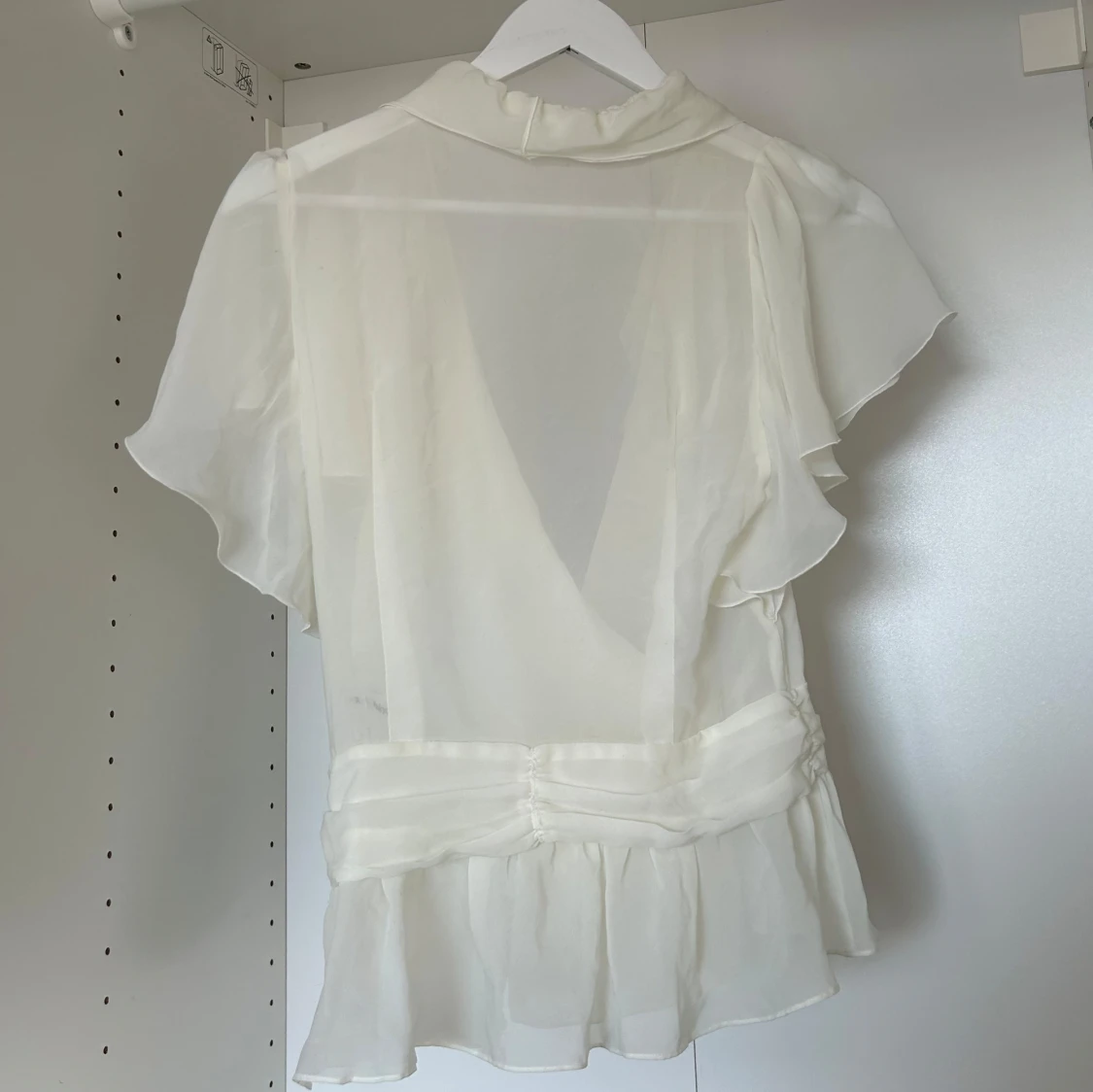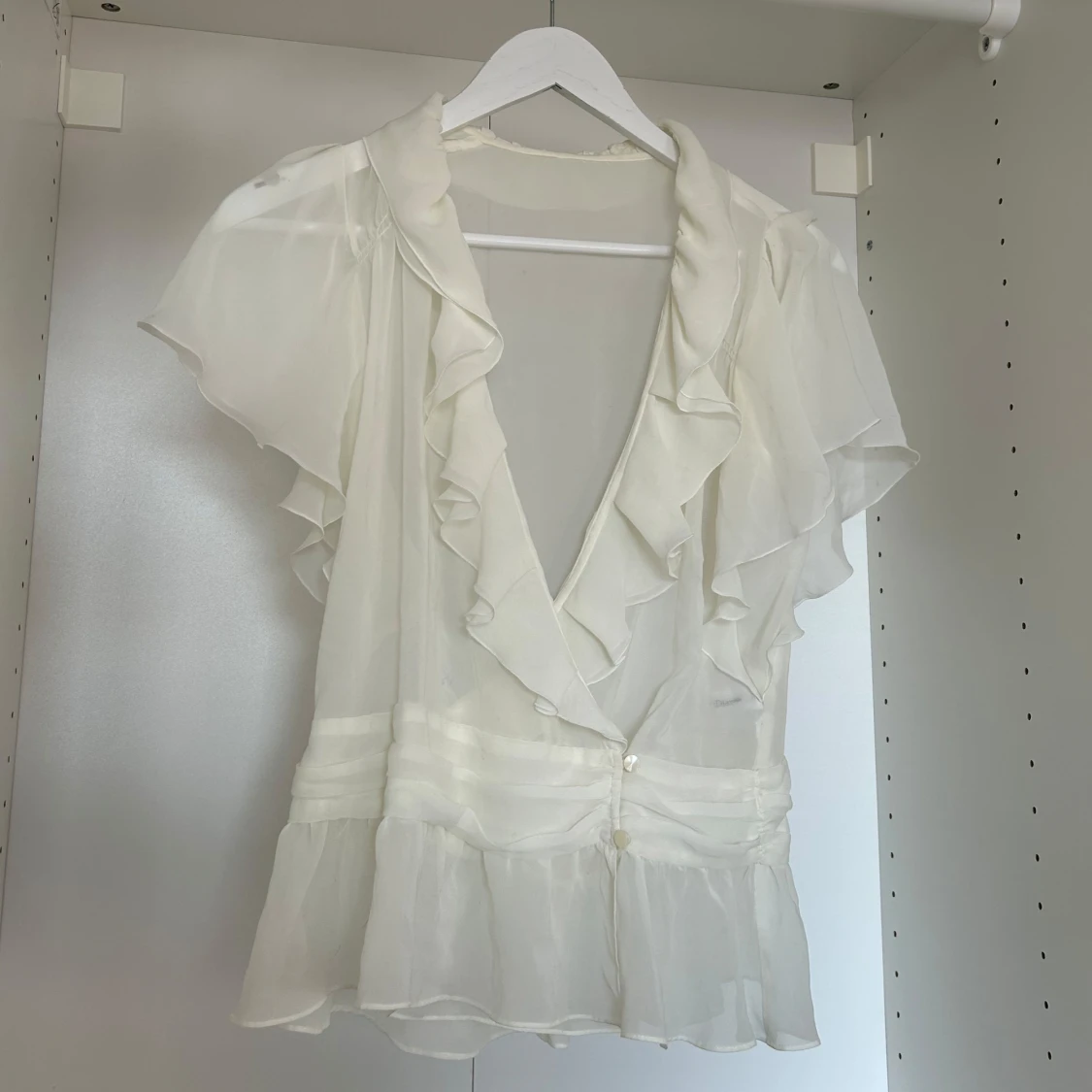 Vit blus som man knäpper med knappar. V-ringad med volanger. Såsåså söt men kommer ej till använding