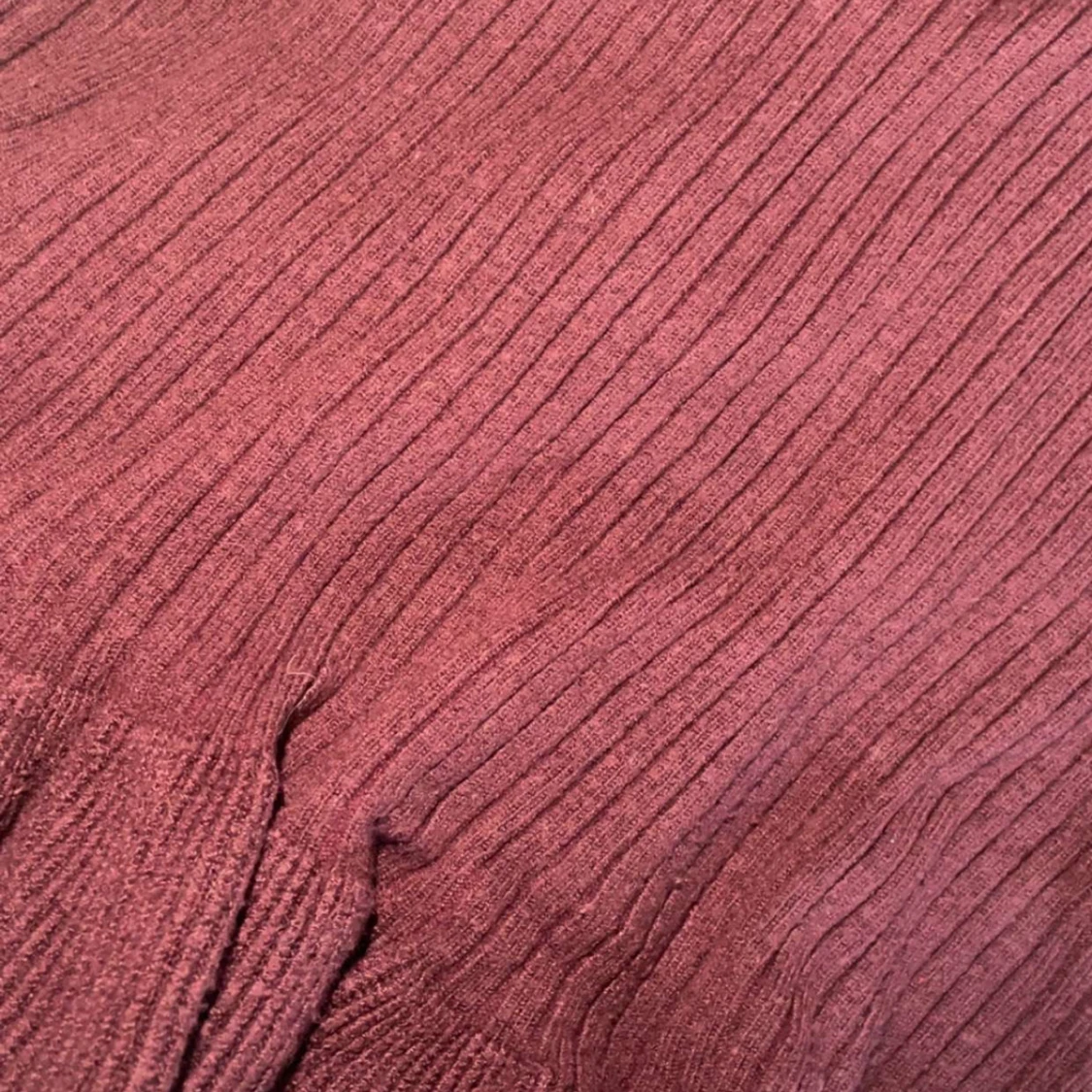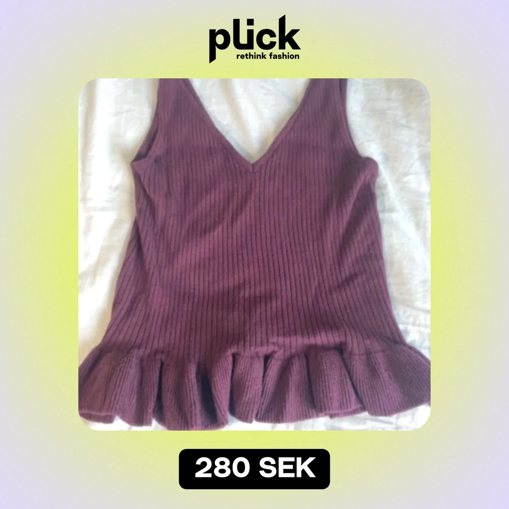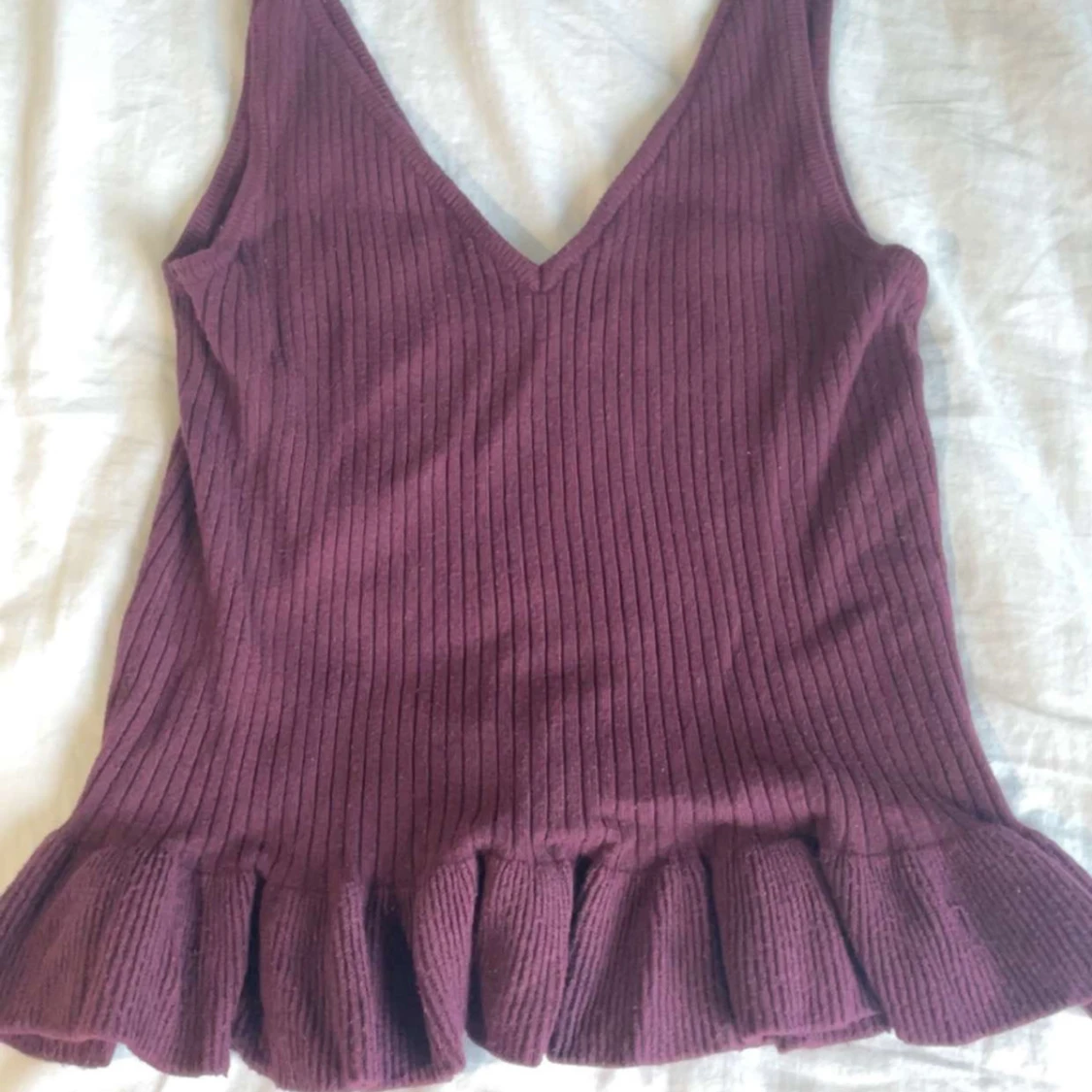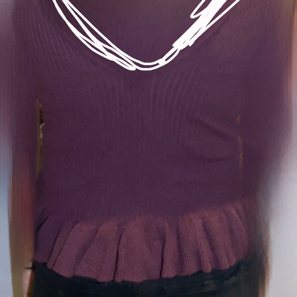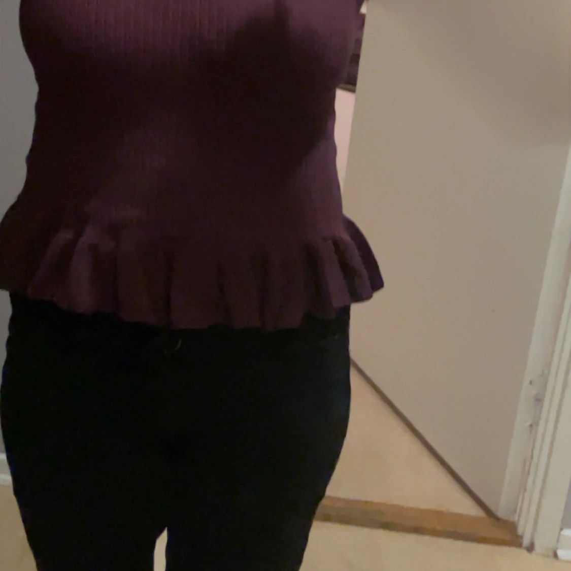 En mörk lila V-blus med volanger nederst, använd 2 gånger.