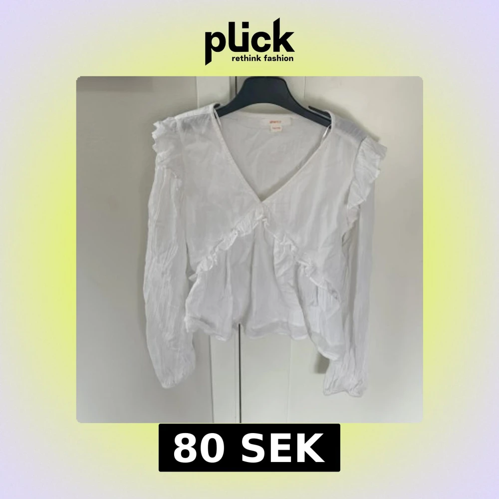 Supersöt vit blus från Gina Tricot med v-ringning och volangdetaljer framtill och på axlarna. Långärmad och i lätt, luftig bomull som ger en romantisk vibe. Perfekt att styla med jeans eller kjol för en fräsch look.