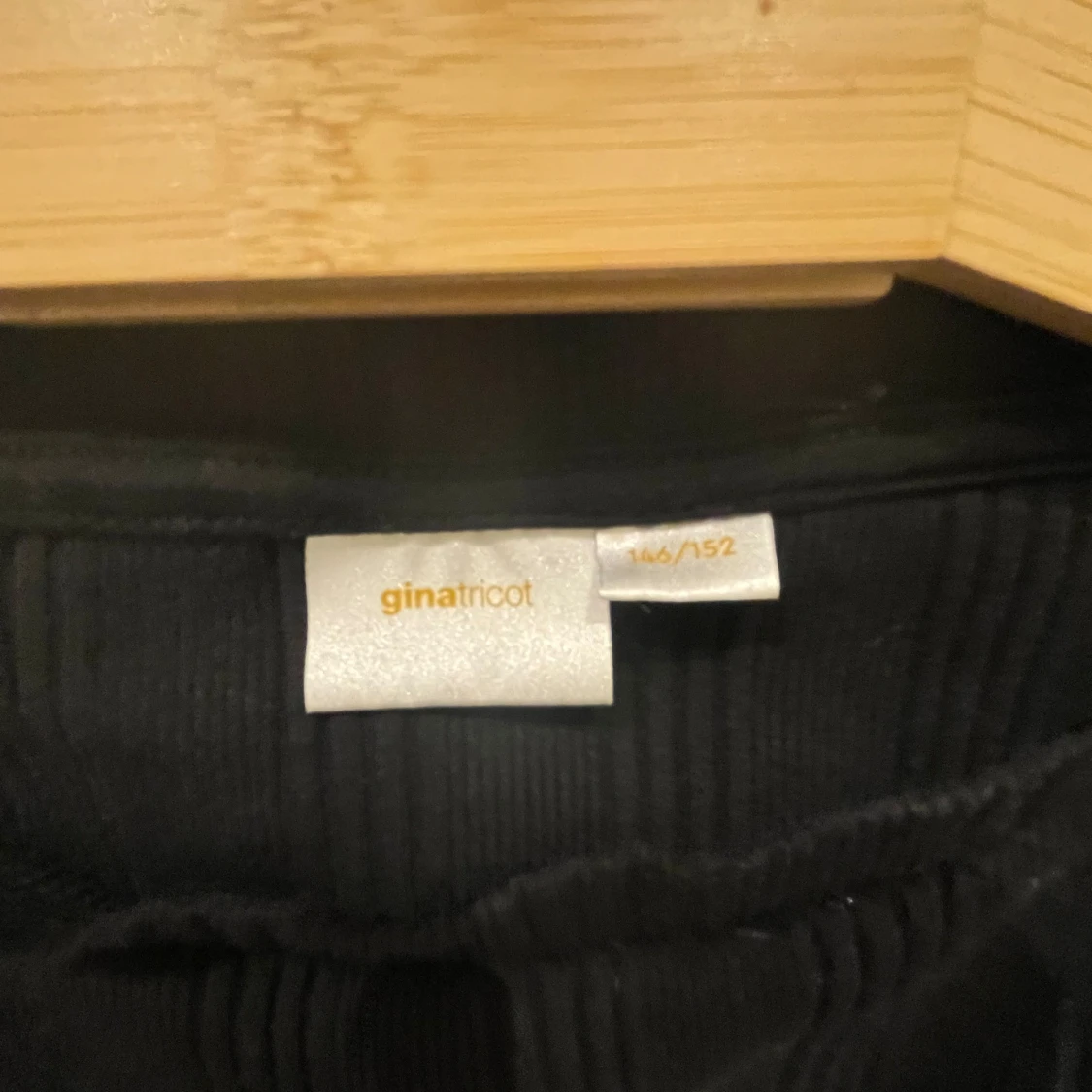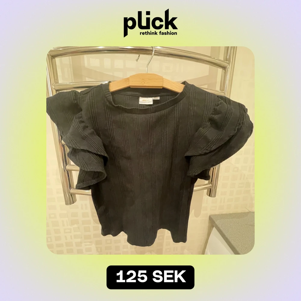 Säljer en snygg svart ribbad topp från Gina Tricot. Den har volangdetaljer på ärmarna som ger en extra touch. Perfekt för både vardag och fest! 🖤