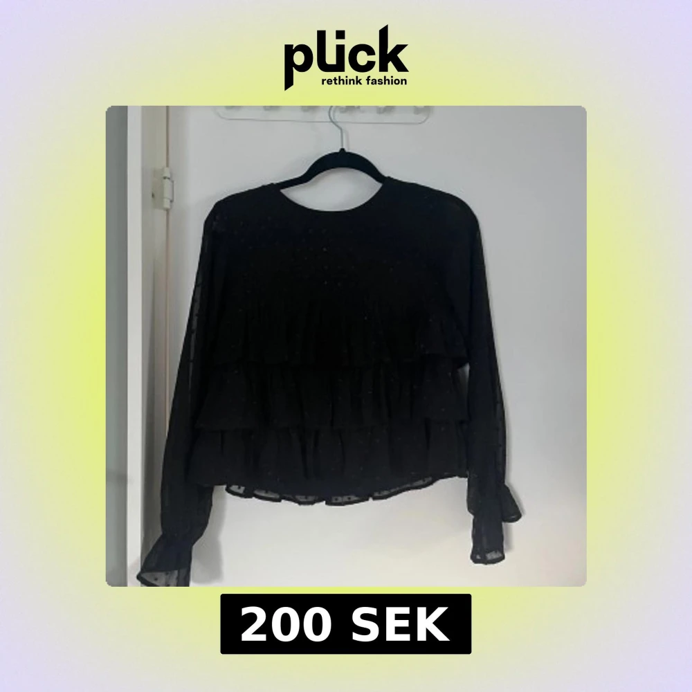 Supersnygg svart blus från Gina Tricot med volanger och diskreta prickar. Långärmad modell i tunn, luftig polyester med transparenta ärmar och volangdetaljer framtill. Perfekt för dig som gillar trendiga och feminina plagg.
