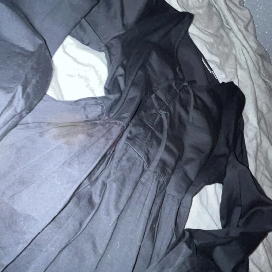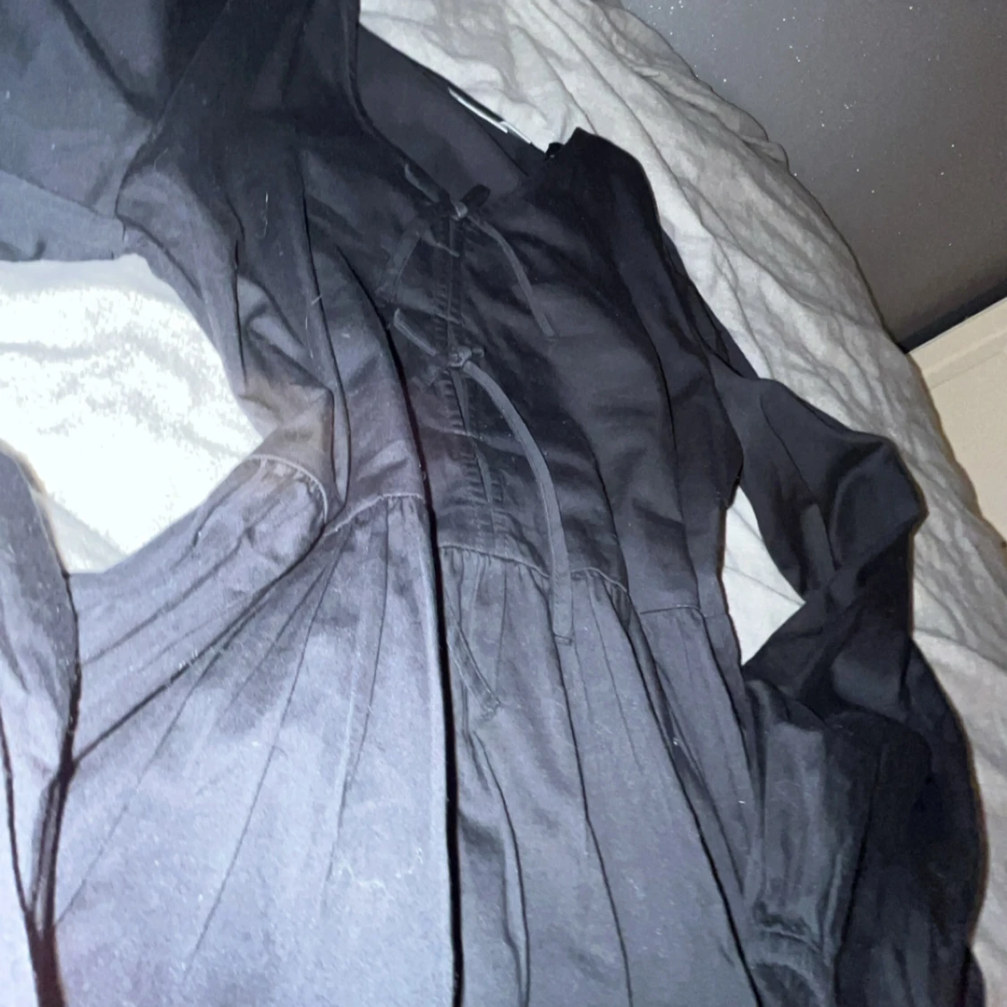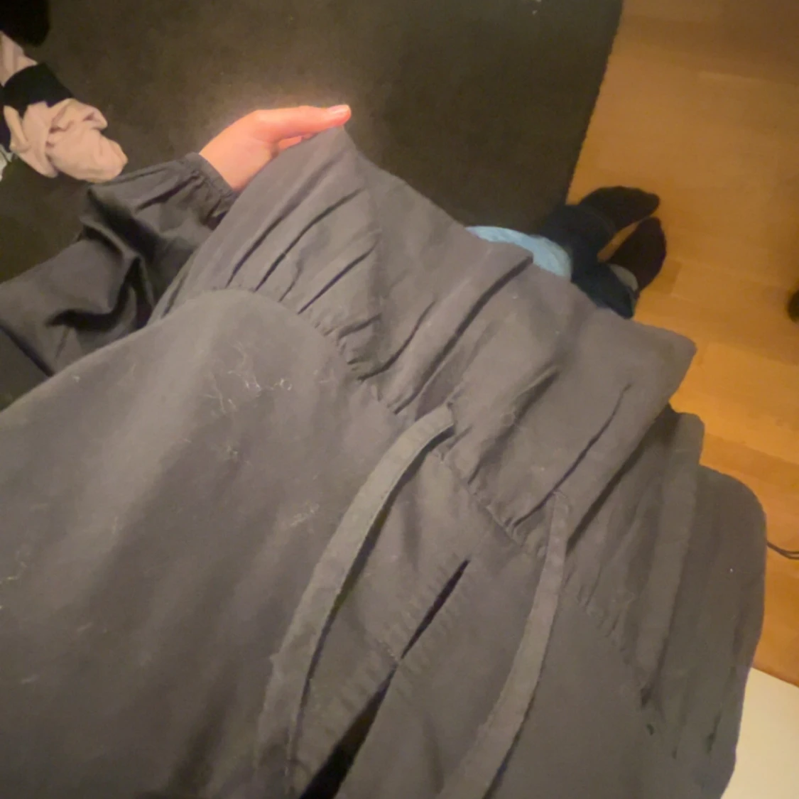Svart blus med långa ärmar och snygg snörning framtill vid halsen. Modellen har en lätt rynkad midja och faller fint. Tyget är tunt och känns luftigt, perfekt för dig som gillar en stilren look med lite edge.
