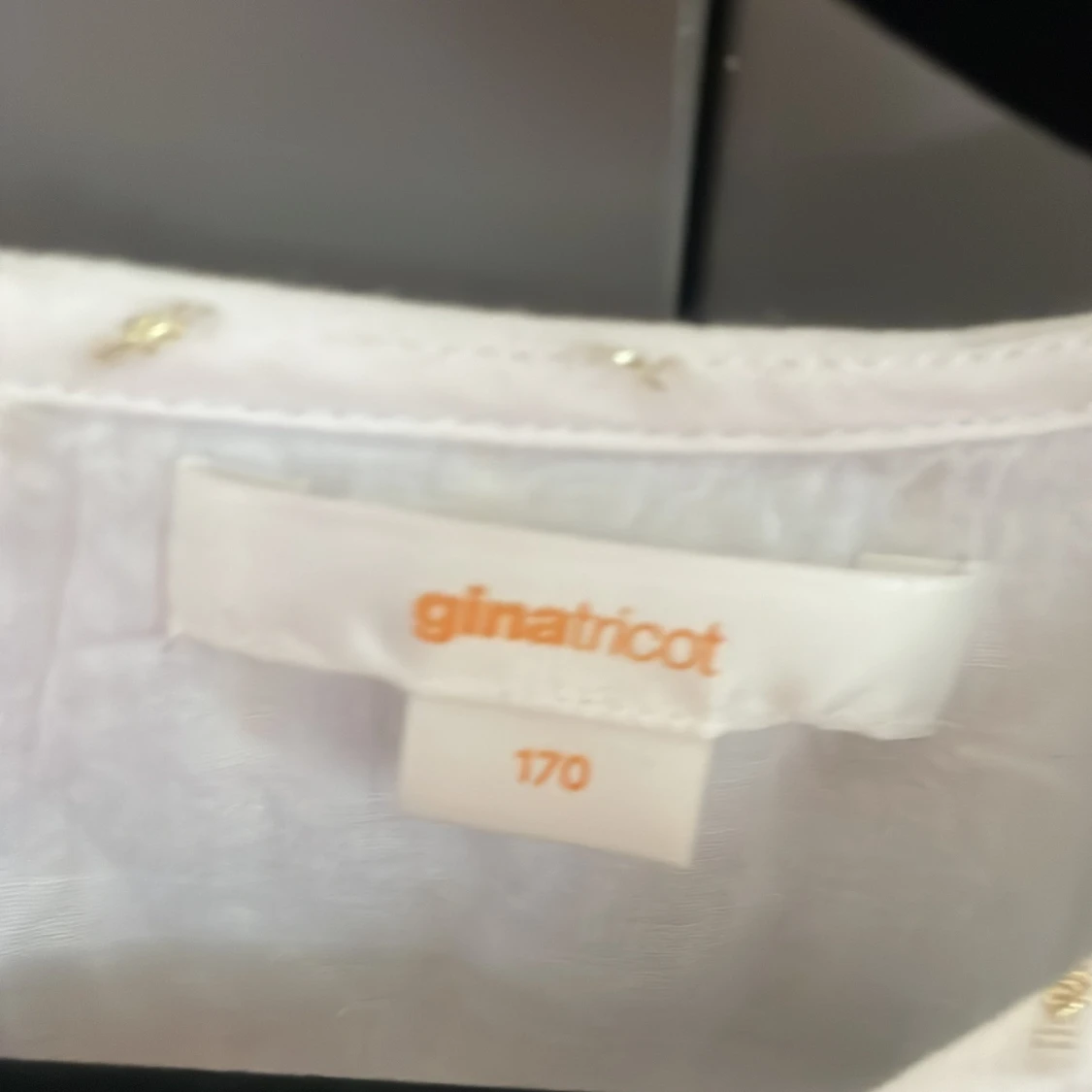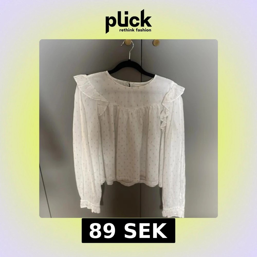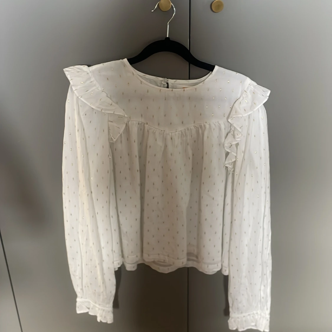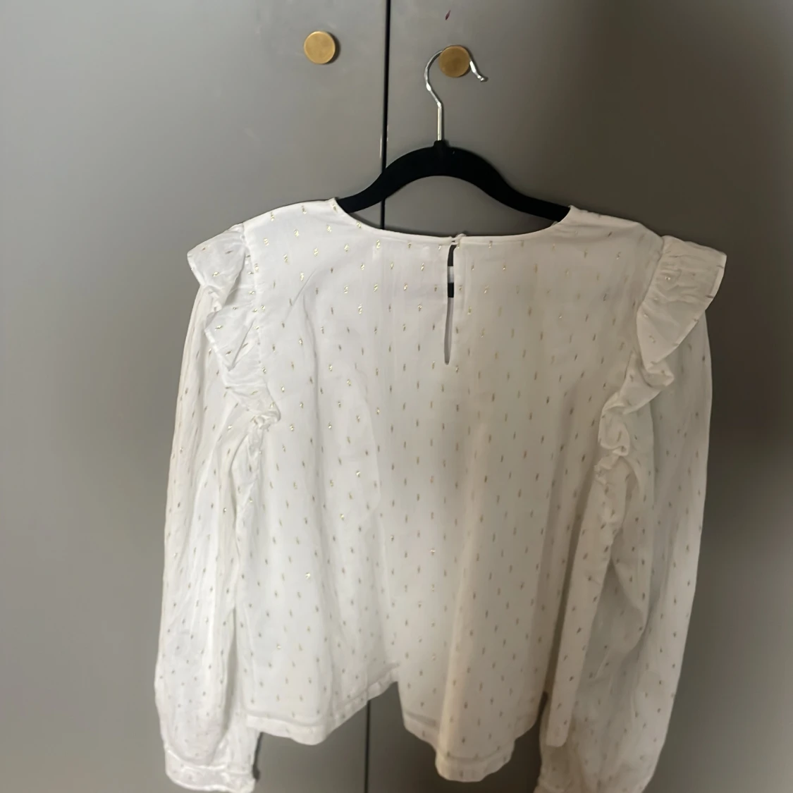 Supersöt vit blus från Gina Tricot med diskreta guldprickar och volangdetaljer vid axlarna. Blusen har långärmade ärmar med lätt puff och knäppning bak i nacken. Perfekt för dig som gillar en romantisk och trendig stil.