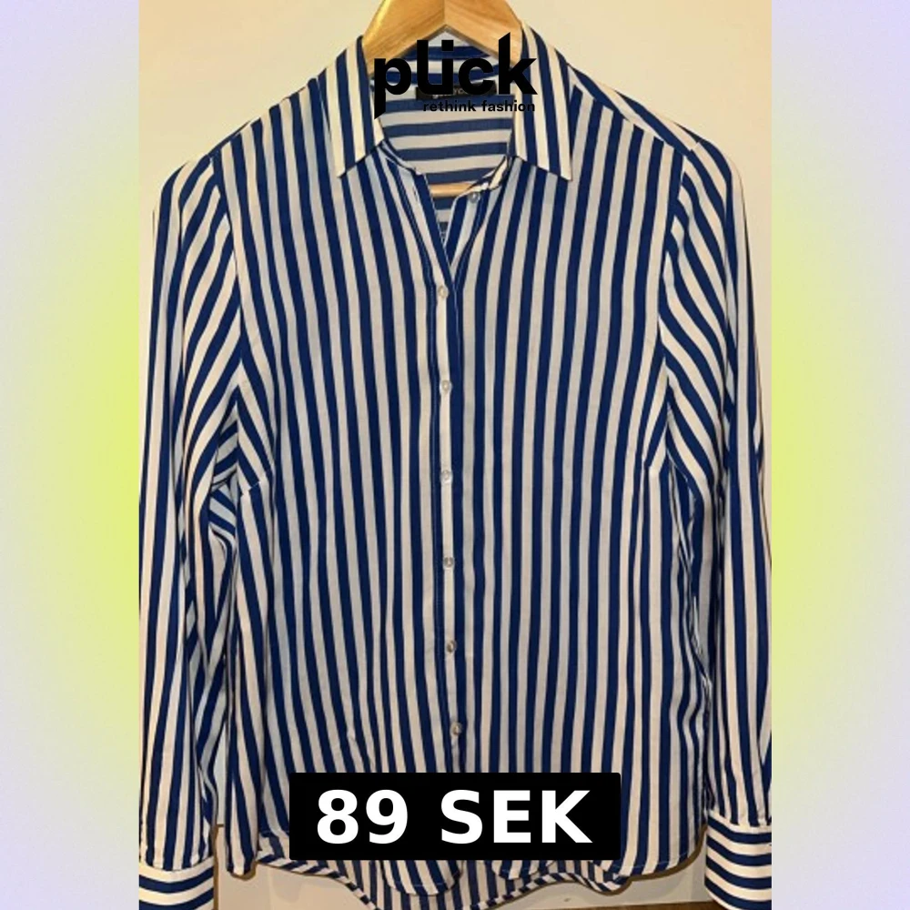 Snygg skjorta från Gina Tricot i blåvitt randigt mönster. Klassisk krage, långa ärmar med manschett och knäppning framtill. Skjortan är i tunn bomull, perfekt för en fräsch och stilren look.