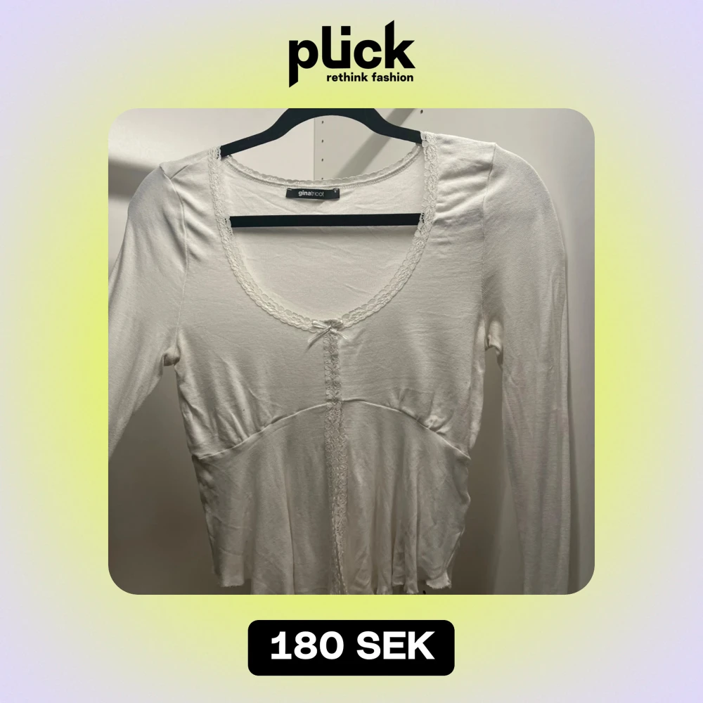 Säljer en söt vit långärmad topp från Ginatricot med spetsdetaljer och en liten rosett framtill. Toppen har en v-ringad design och är gjord i ett mjukt material.