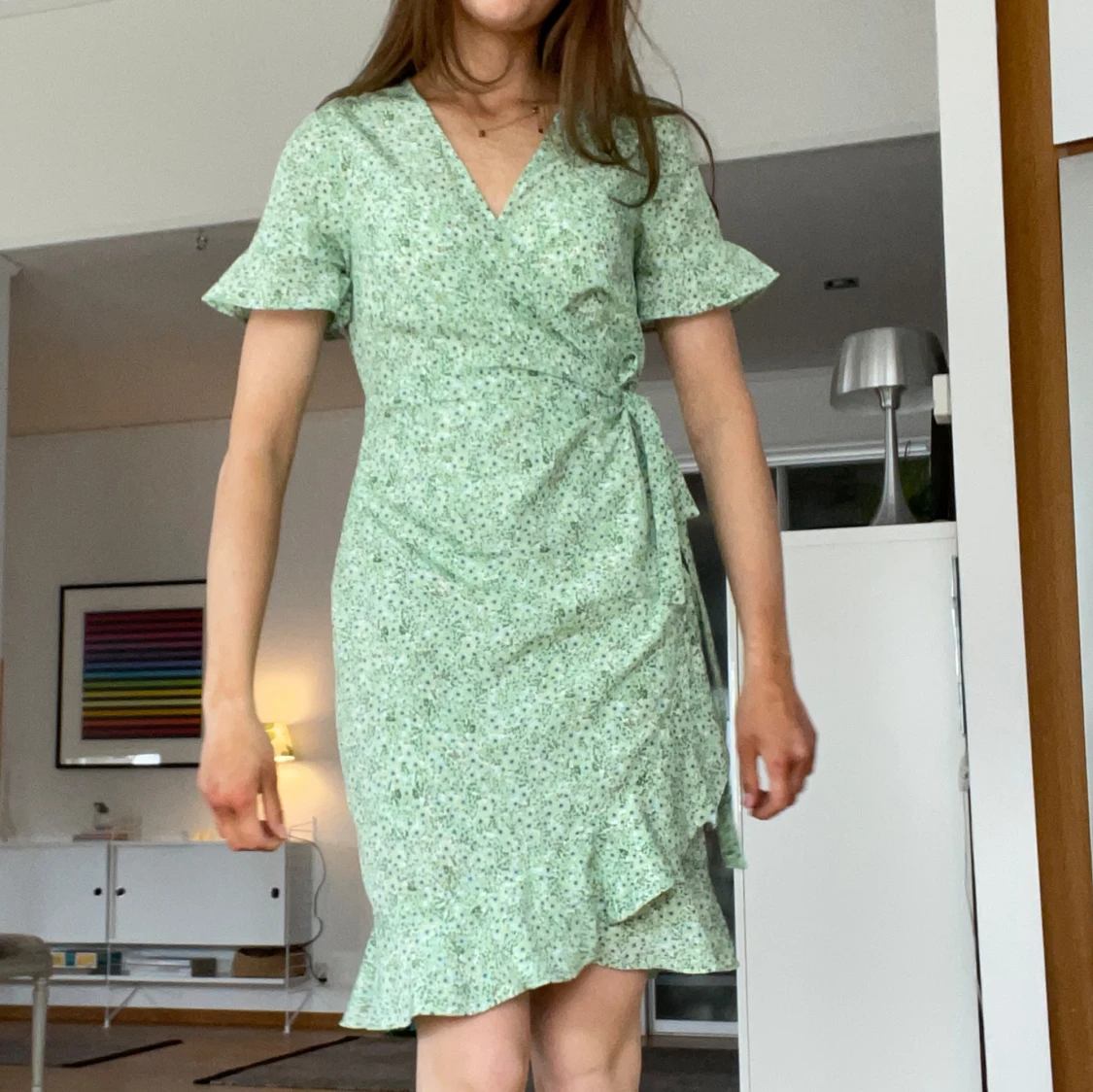 Säljer denna sjukt fina klänningen med volang och band i midjan från Vero Moda! Sparsamt använd och inga defekter finns!💓💓