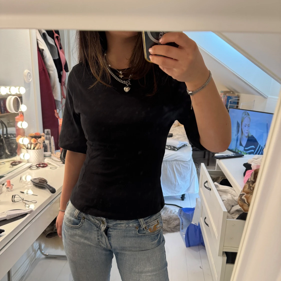 Såå snygg T-shirt från Gina med en ”insydd” look, köptes nyligen men har tyvärr inte kommit till användning!💕☺️säljer en likadan i vit🙏🏽