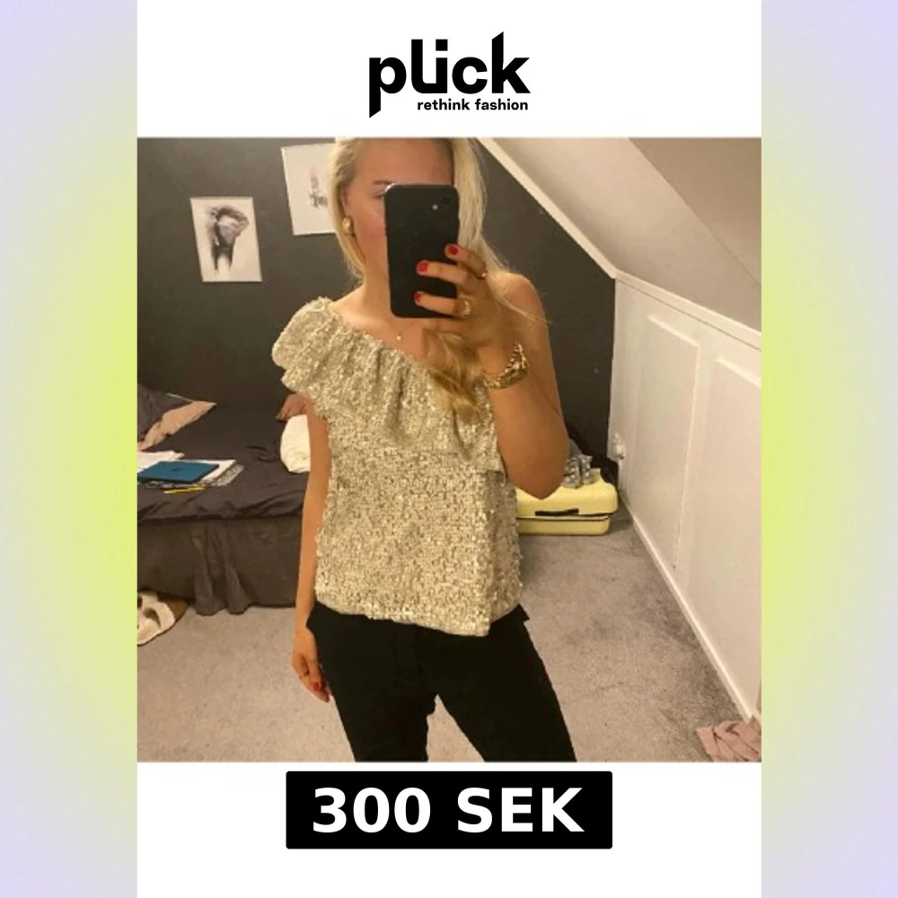 Supersnygg glittrig paljett oneshoulder topp perfekt nu till nyår! Den är ifrån Second Female! Står på lappen storlek L men skulle mer säga att den sitter som en M! I mycket bra skick💗 Första bilden är tagen från tjejen jag köpte den ifrån!!
