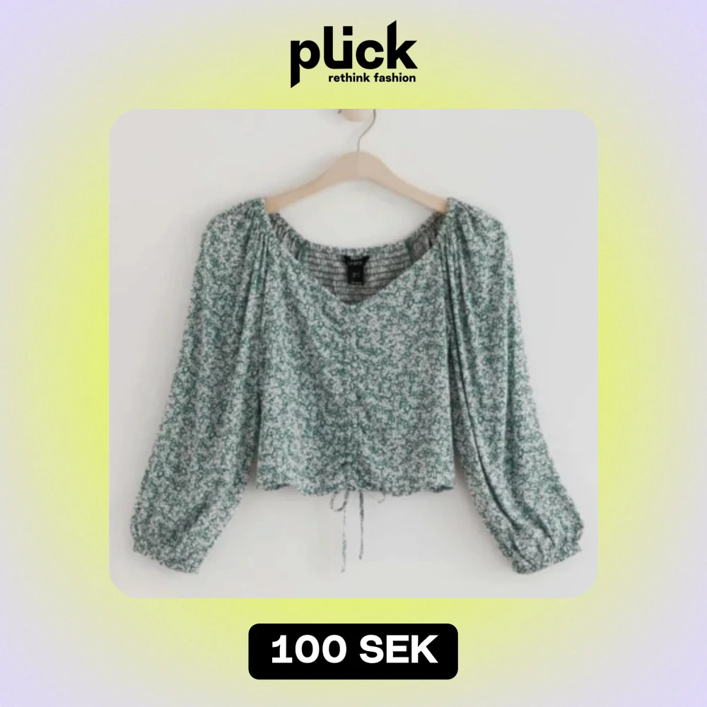 Blommig blus i en vacker färg som är typ grå-blå-grön (syns bäst på bild 1). Har långa ärmar, ett stretchigt parti på baksidan för bästa passform och en dragsko framtill som kan knytas som man själv vill. Säljer även en likadan blus med annat mönster