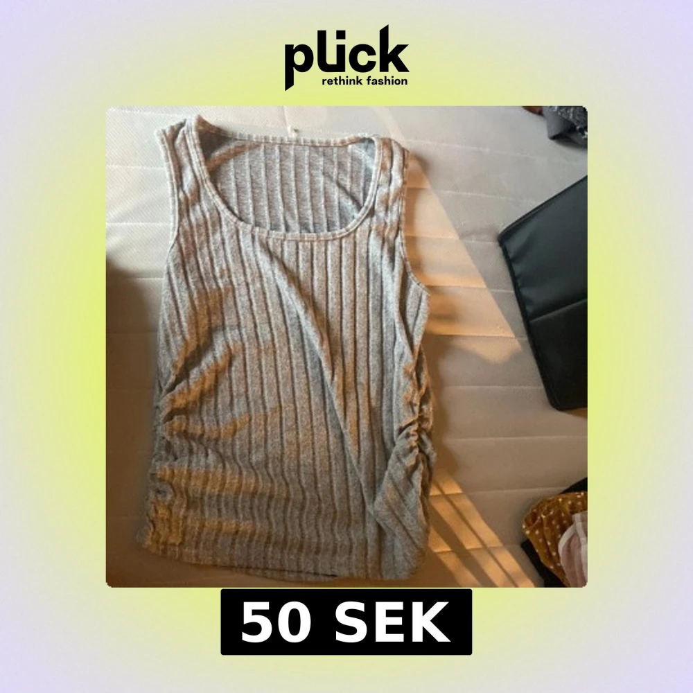 Säljer en grå ribbad linnetopp med rynkade detaljer på sidan. Toppen är ärmlös och har en rund halsringning. Perfekt för en avslappnad och stilren look.