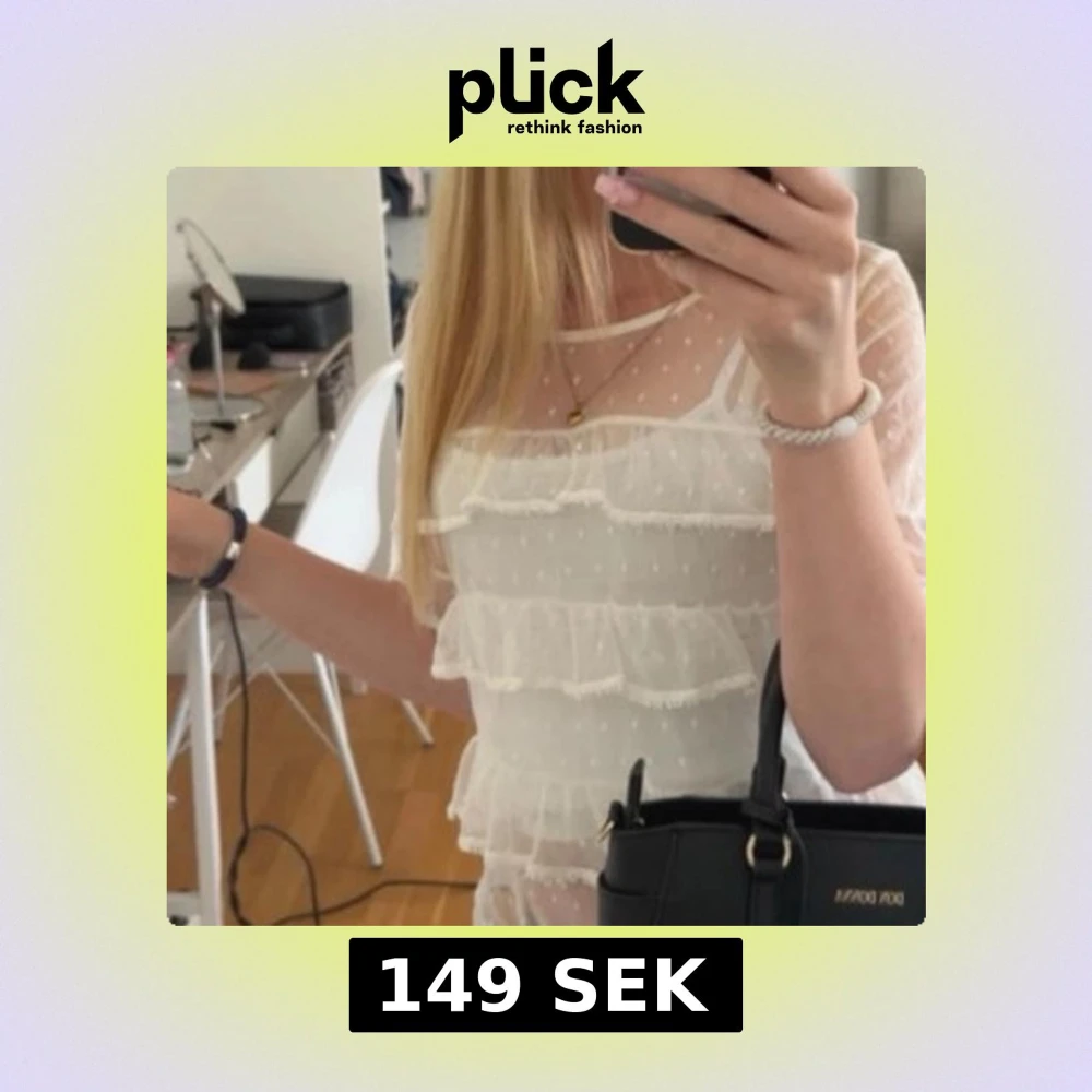Superfin gräddvit meshblus med kort ärm, volangdetaljer och prickigt mönster. Passar storlek XS.