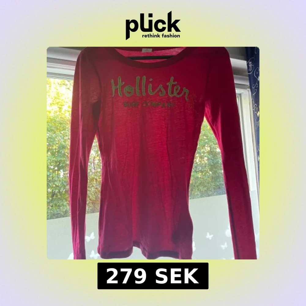 Snygg röd långärmad tröja från Hollister med trycket 'Hollister Surf Company' i grönt framtill. Tröjan har rund hals och är gjord i mjuk bomull. Passformen är normal/lite stor och materialet är lätt och skönt.