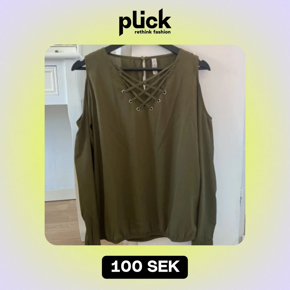 Grön blus med ”snören” framåt.