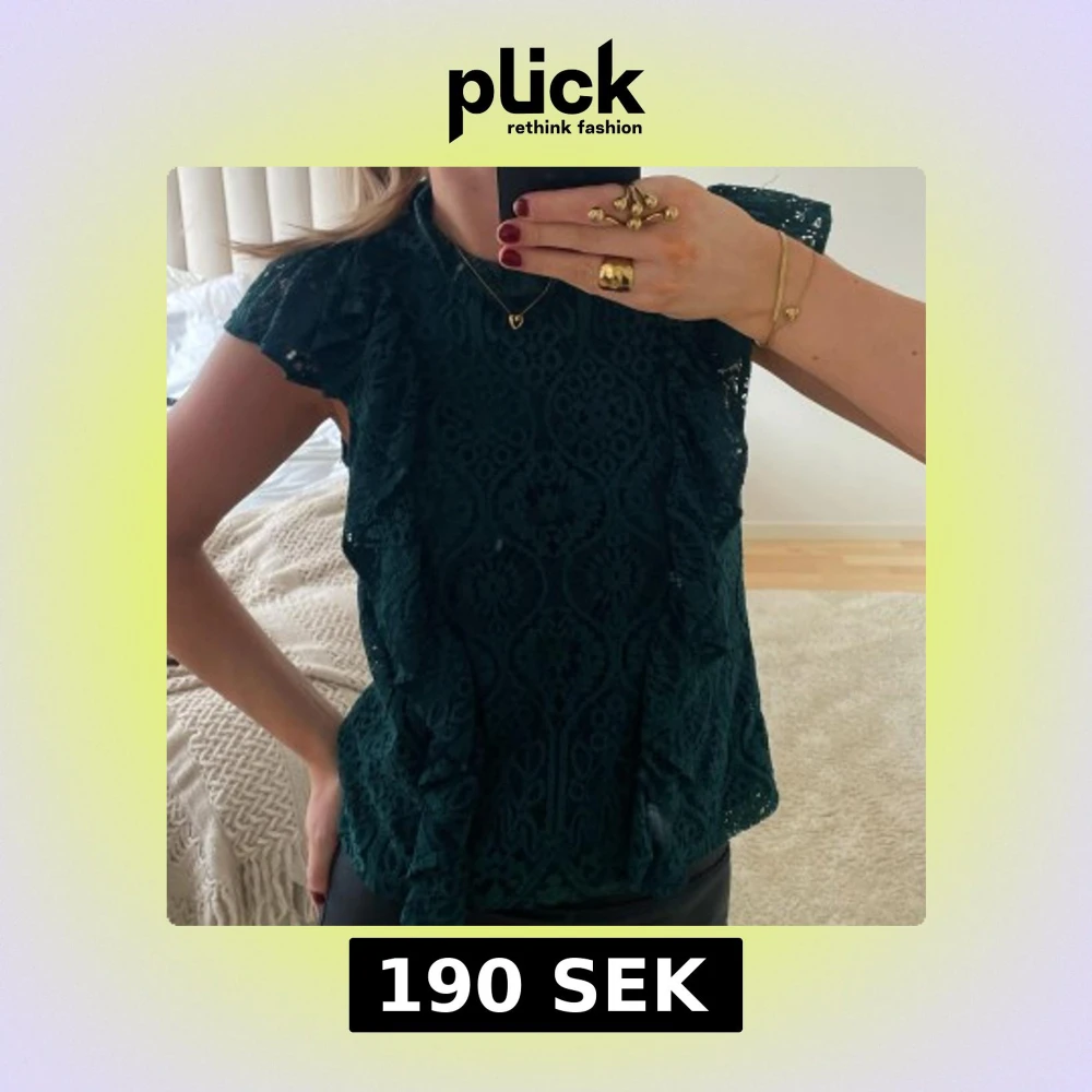 Superfin mörkgrön blus med volanger och spets. Knapp i nacken. Bra skick!