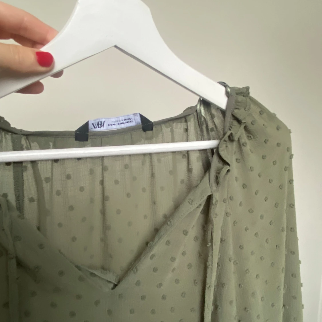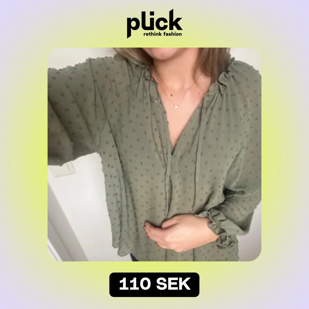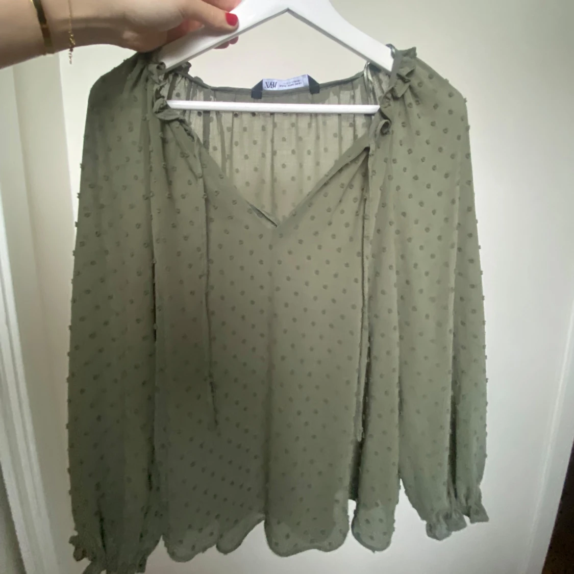 Grön blus från zara med prickar och volanger vid armslut. Strl xs men skulle säga att den är som en s