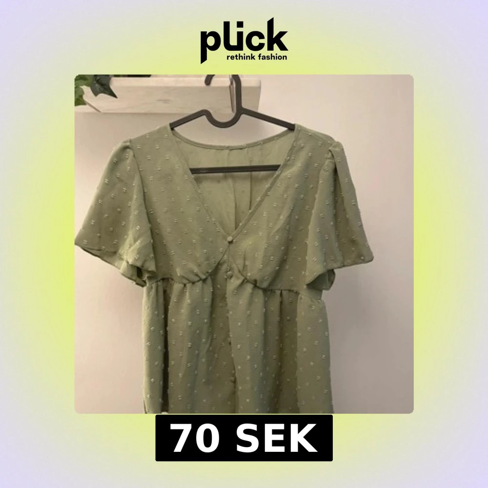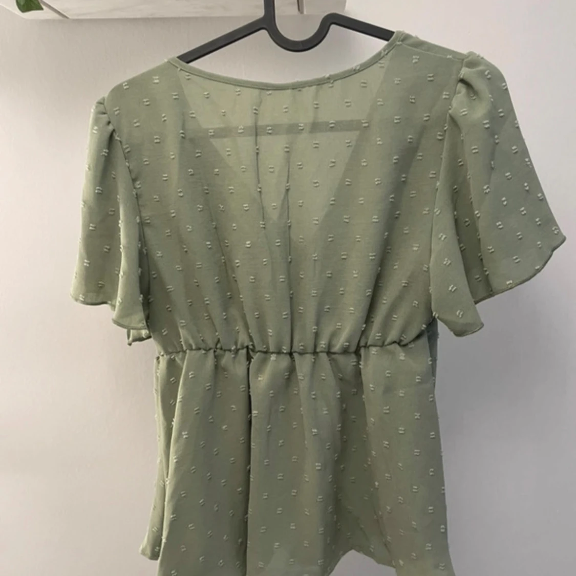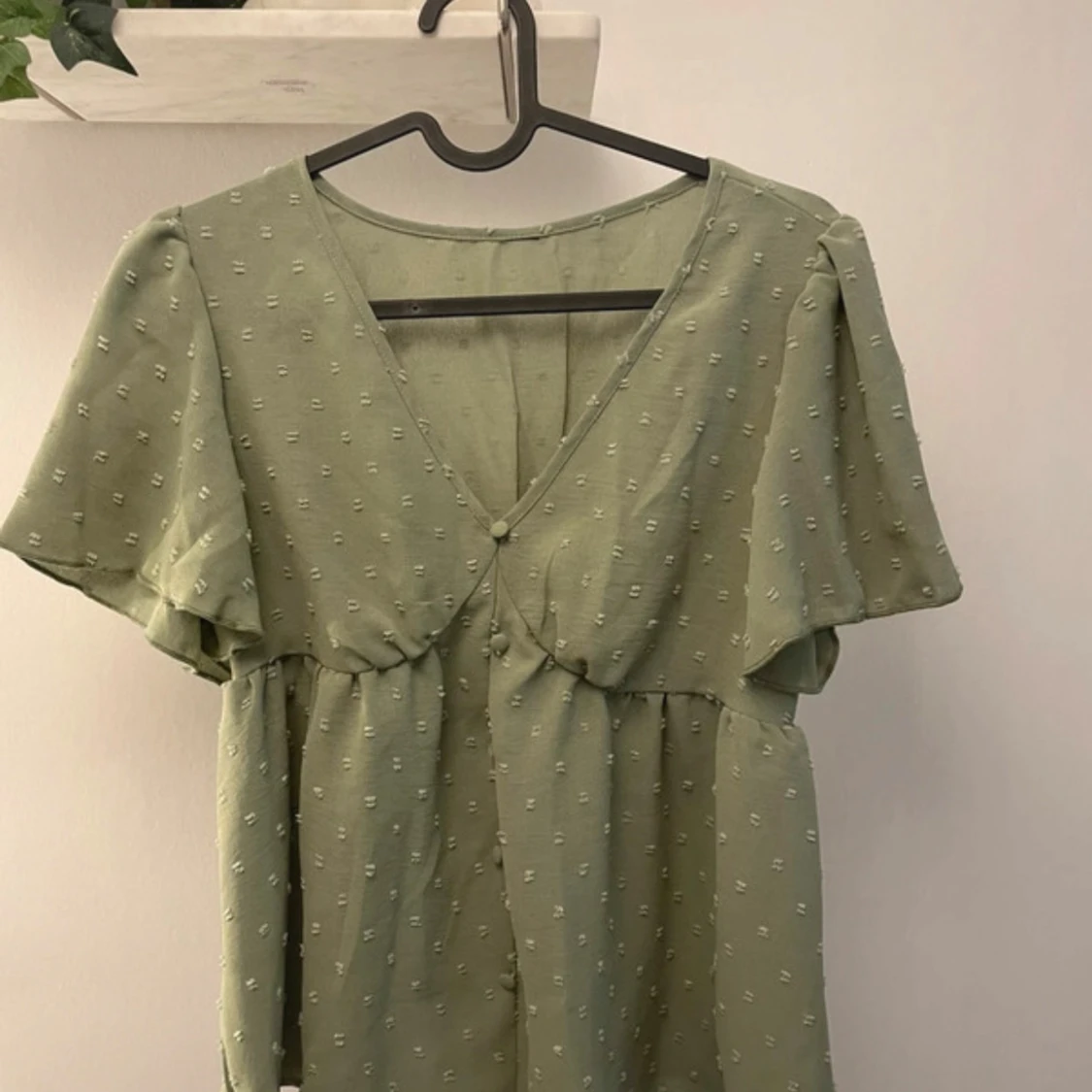 Säljer en söt ljusgrön blus med v-ringad front och små knappar. Perfekt för vår och sommar!