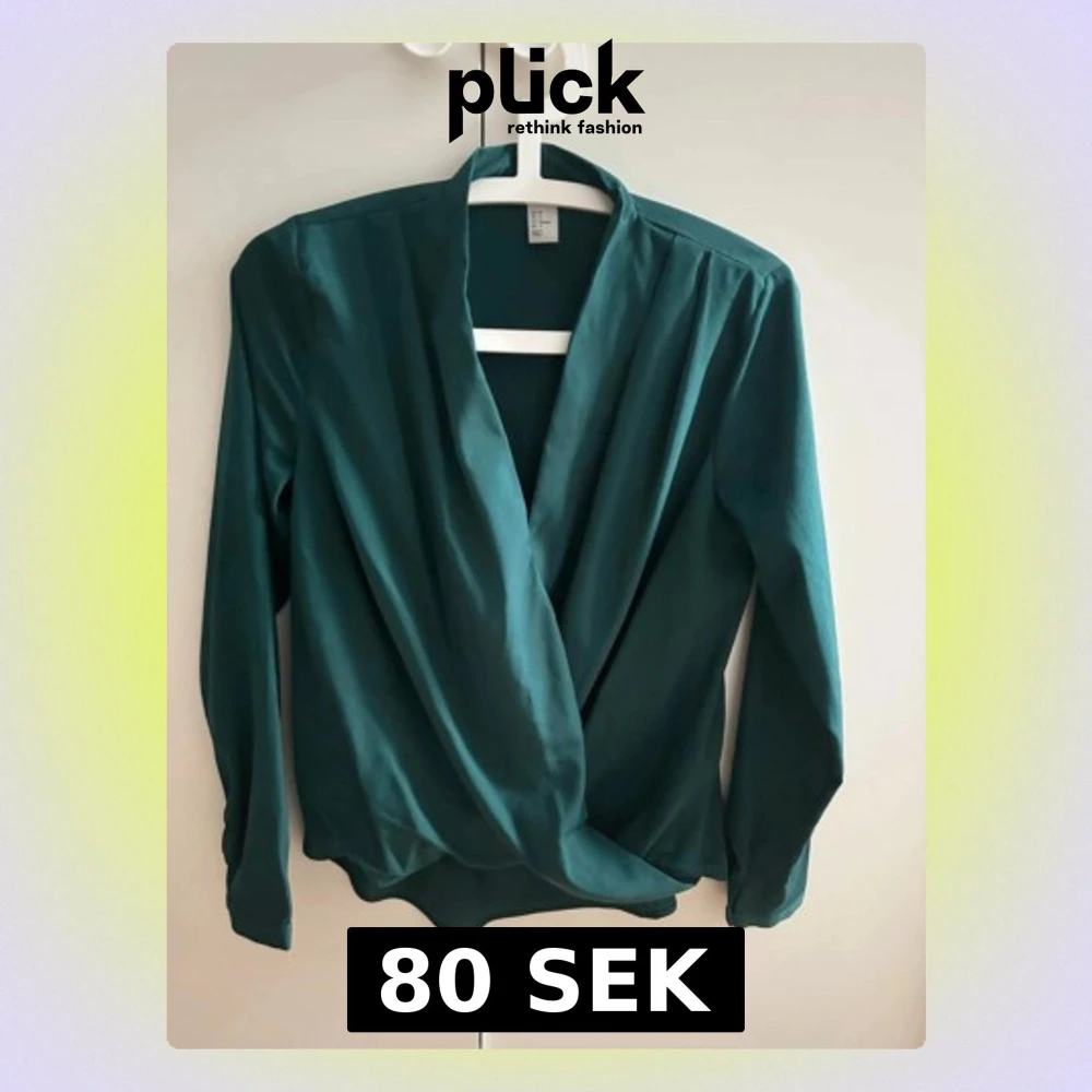 Snygg mörkgrön omlottblus från H&M med långärmad design och djup v-ringning. Blusen har ett elegant omlottfall framtill och är tillverkad i mjuk och slät polyester som faller fint. Perfekt att styla med jeans eller kjol för en trendig look. Tyvärr har blusen ett par defekter vid sidan