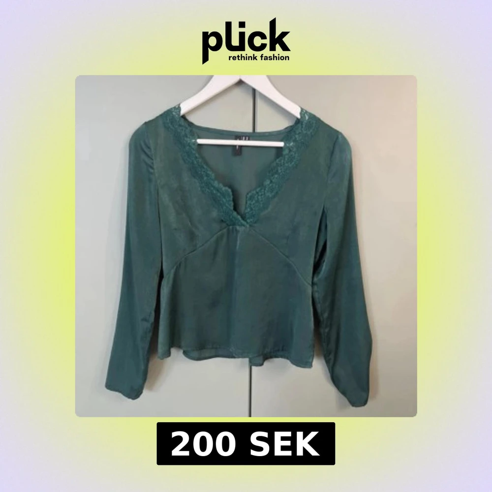 Supersnygg grön blus från Vero Moda med v-ringning och spetsdetaljer längs halsen. Blusen har långa ärmar och en lätt glansig yta som ger en lyxig känsla. Resår i midjan baktill för en smickrande passform.